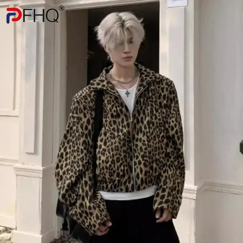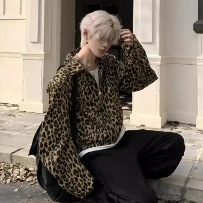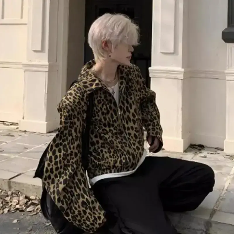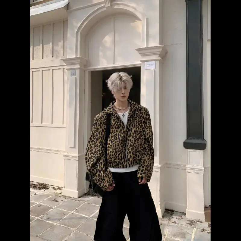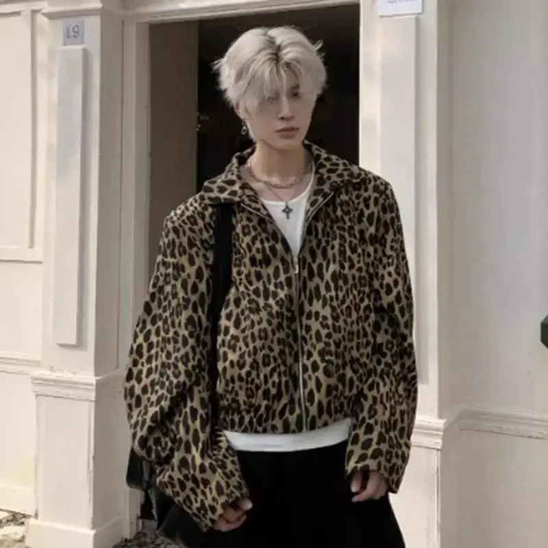 LeopardPrintMen'sDenimJacketAmericanStyleNewNicheTurn-DownCollarDesignShortLooseZipperCoatTrend21E7168