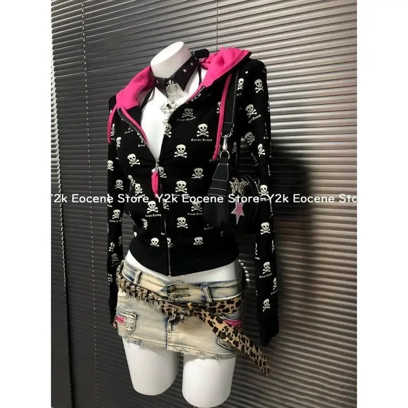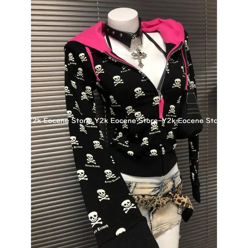 2000s Y2k Gothic Punk Skeleton Print Cardigan Contrast Hooded Sweatshirt Jacket Women Spring Autumn 2025 New Slim Fit Black Tops