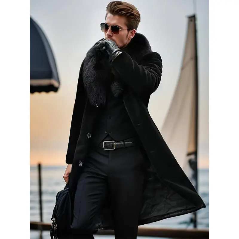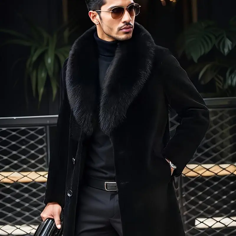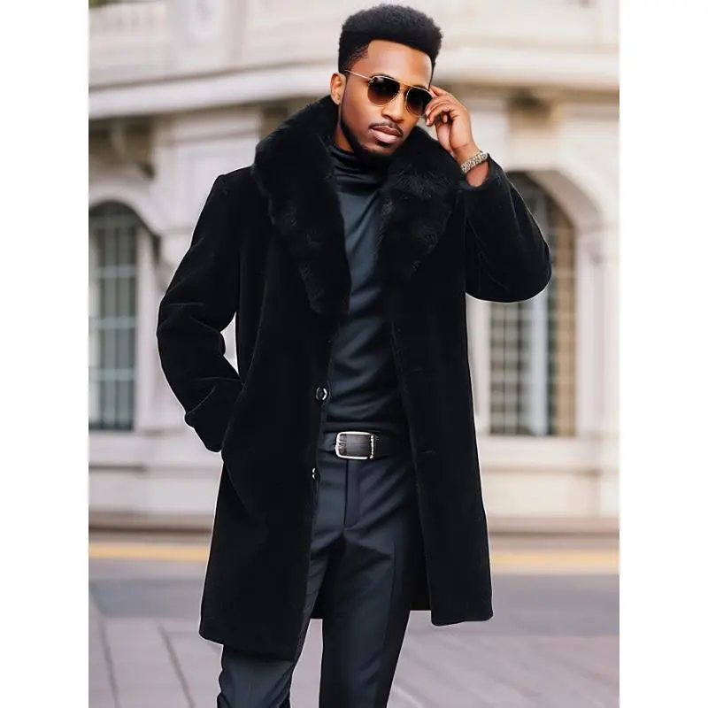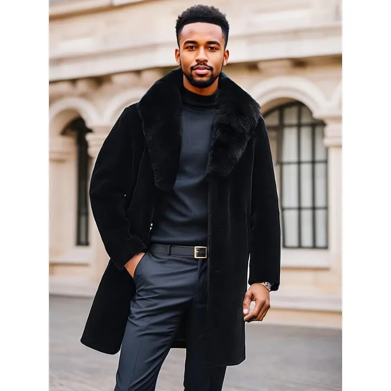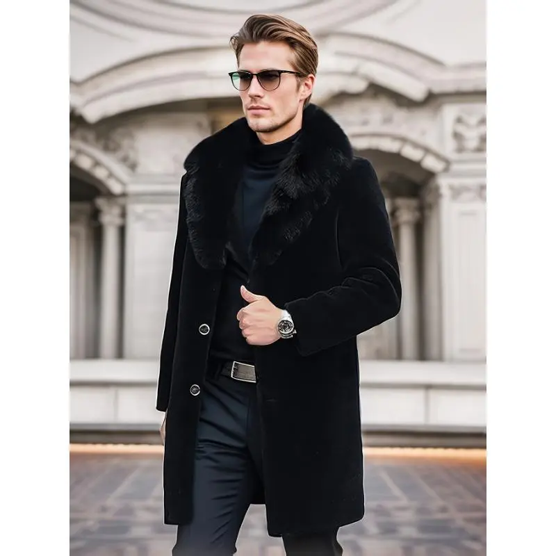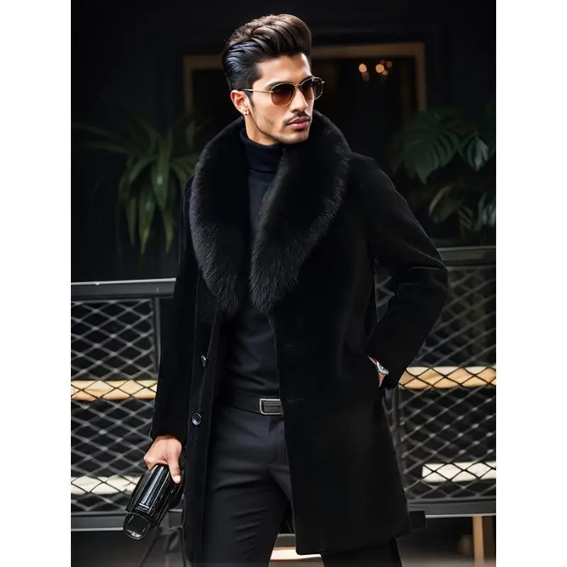 Men's Fashionable Black High-Quality Faux Fur Winter Coat, Long Plush Jacket with Sherpa Collar, Soft and Warm, Casual Business Party Style, Qin Grass, Rabbit Fur Menswear Polyester