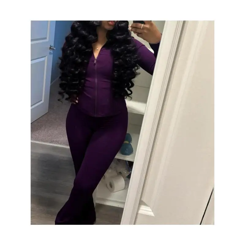 Do you want a set of clothing that can easily transition between the gym and the street while exuding a sexy charm? This two - piece set for women is definitely your ideal choice! The set includes a pair of high - waisted flare pants. The high - waisted design instantly raises the waistline and elongates the leg lines, giving you an enviable long - leg proportion. The flared trouser shape is both retro and stylish. As you walk, it sways gracefully, fully displaying the feminine charm. The matching casual sports top is simple yet stylish, perfectly fitting the style of the pants and creating a harmonious and unified sense of fashion. It is made of highly elastic fabric. Whether you are doing high - intensity training in the gym, such as squats and stretches, or strolling on the street, it can provide you with an ultimate comfortable experience, allowing you to move freely without any sense of restraint. Whether you go to the gym to sweat or hang out with friends at a party, wearing this set, you can be confident and easily become the focus of attention, showing your unique fashion taste. Don't hesitate any longer. Hurry up and add it to your wardrobe to unlock your new fashion look