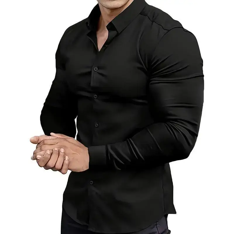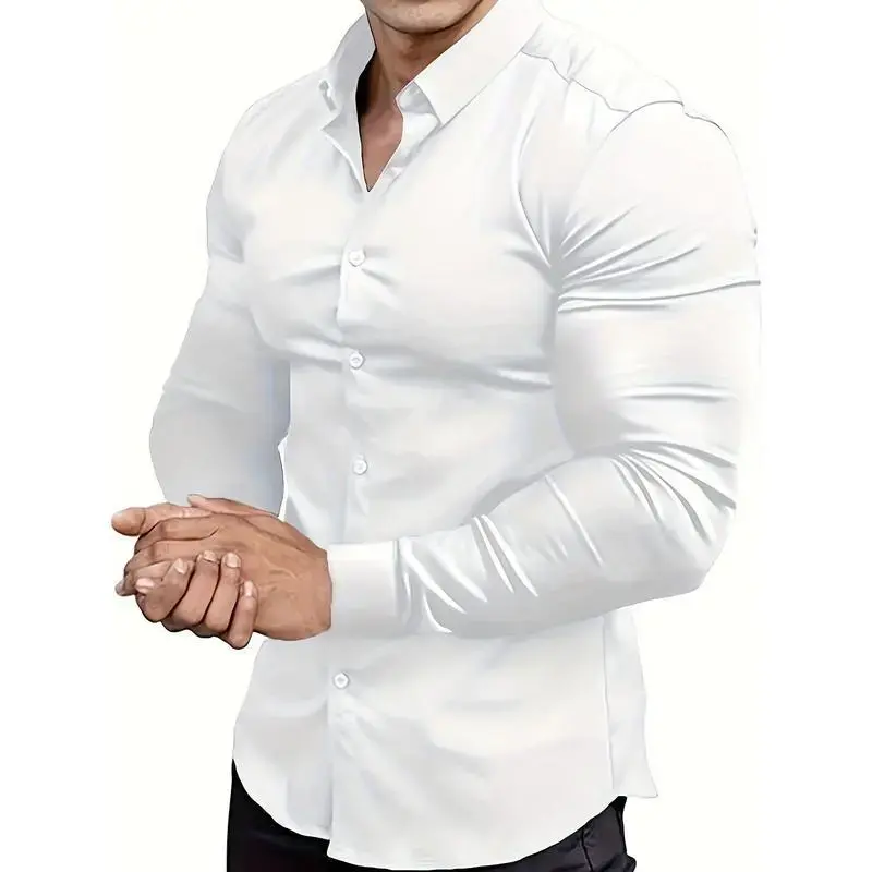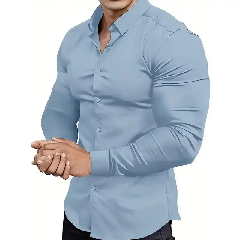 Men's Slim Fit Dress Shirt ✨ Elevate your wardrobe with this Men's Slim Fit Stretch Muscle-Fit Dress Shirt! Crafted from a blend of 55% cotton, 40% polyester, and 5% spandex, this shirt offers slight stretch for comfort. The solid color design and lapel collar style make it a versatile addition to any outfit. Perfect for adults, this all-season shirt is suitable for various occasions. 🌟 Material and Care Details and Style This basic business shirt is a must-have for your wardrobe.
