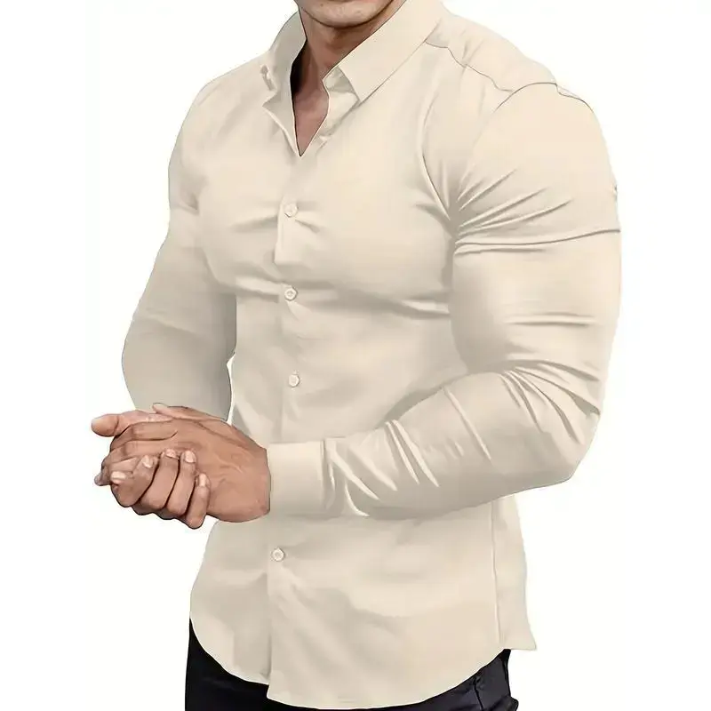 Men's Slim Fit Stretch Muscle-Fit Dress Shirt, Long Sleeve Button-Down Lapel, Basic Business Shirt Collar Menswear Black Top Cotton Beige Polyester Spandex