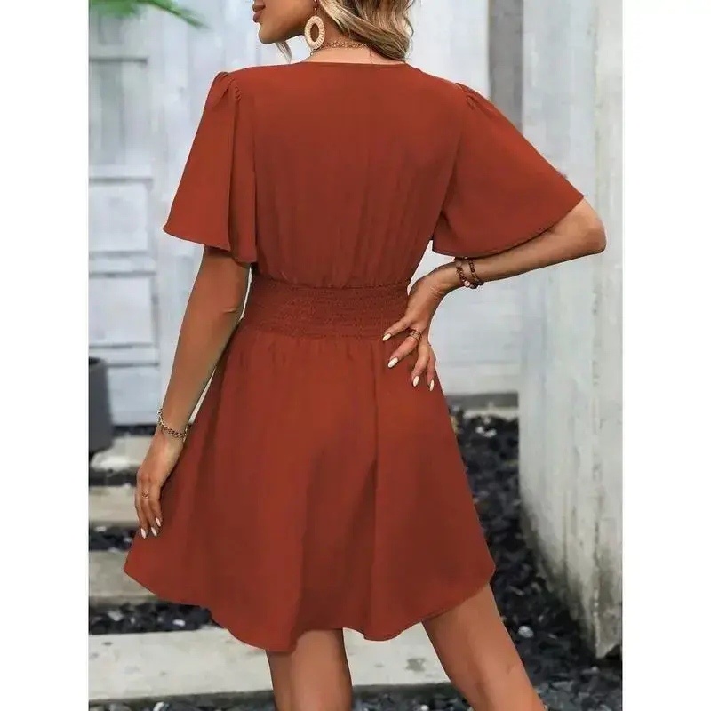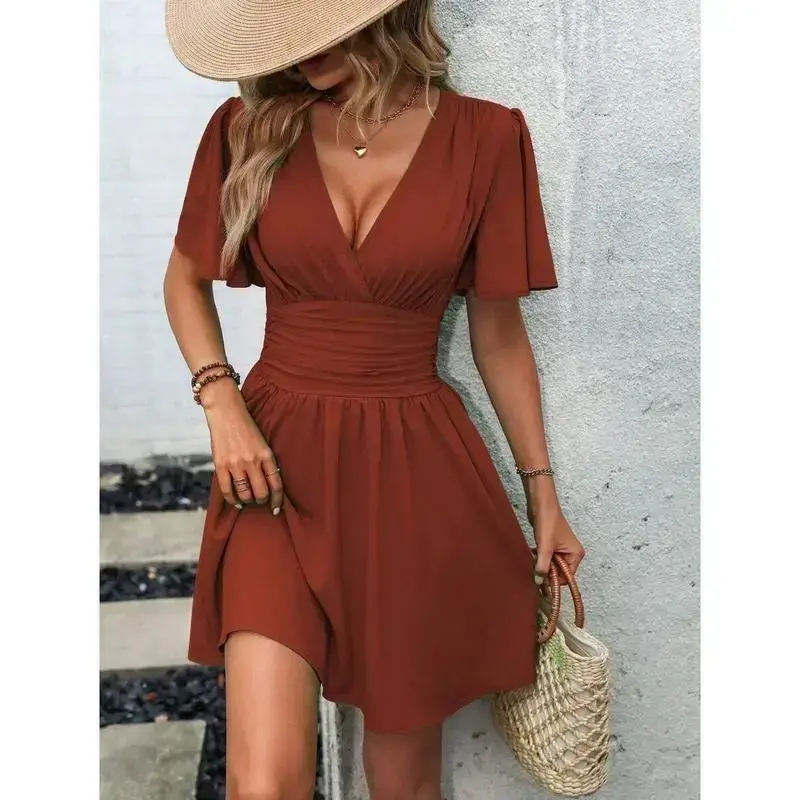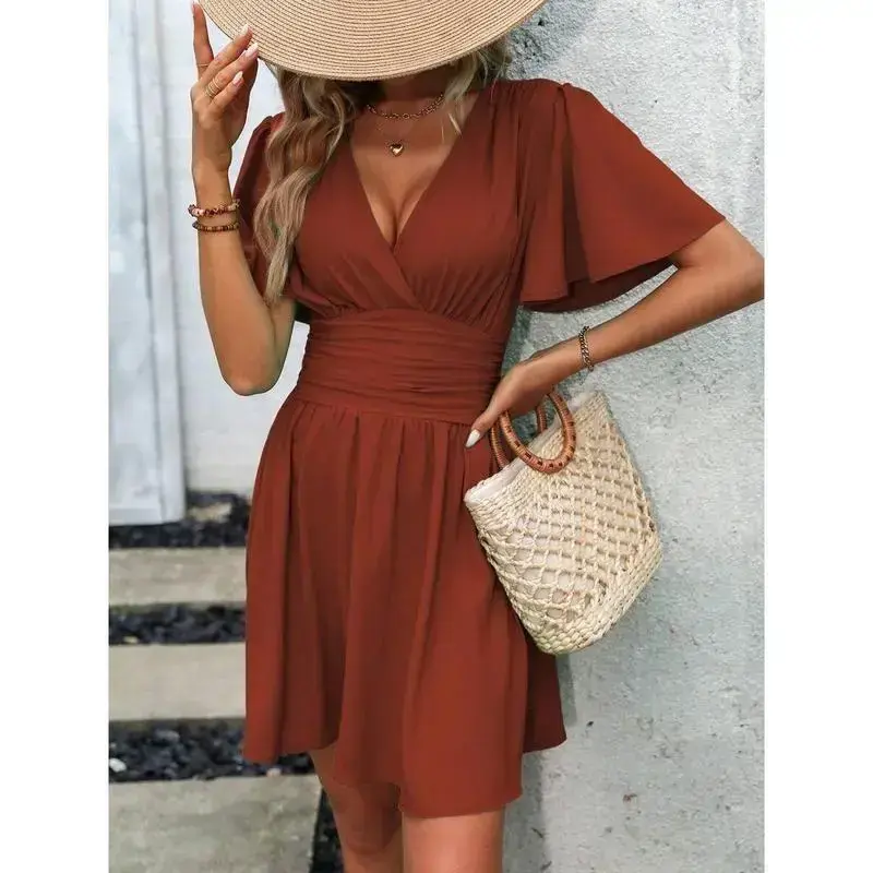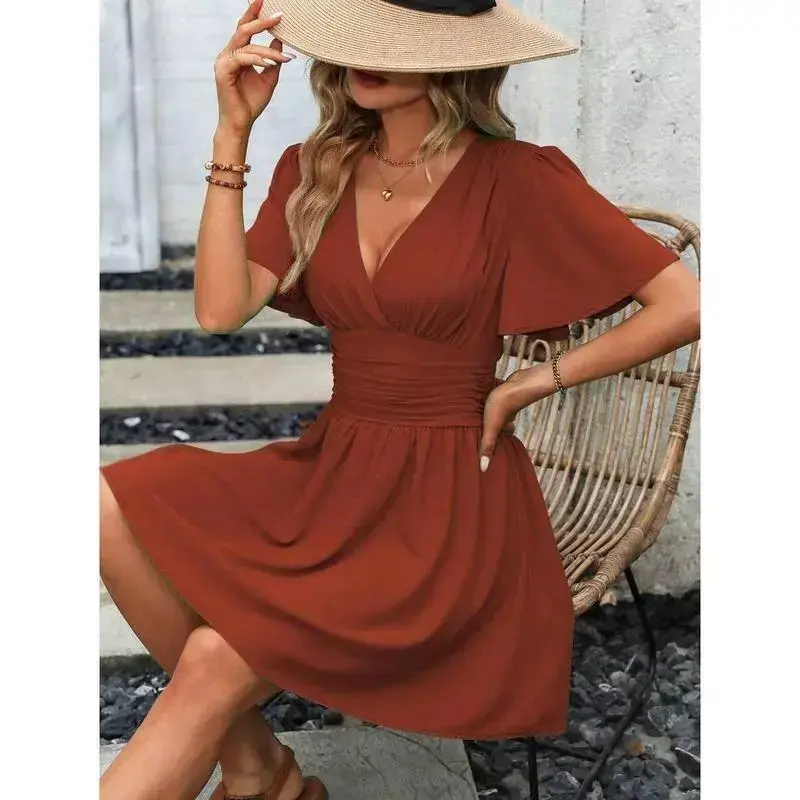 🎀 Elegant Plunging Neck Dress 🎀 This dress features a V-neckline, perfect for beach occasions. It boasts flounce sleeves and a flared hem, enhancing its casual style. The high waist design and A-line shape offer a flattering fit. Ruched details add a touch of elegance. The dress is unlined and made from 100% polyester, woven fabric. It is knee-length and has short sleeves. Regular fit ensures comfort. 🌞 Care and Material 🌞 Machine wash or opt for professional dry cleaning. The fabric is non-stretch and not sheer. The dress is plain in pattern, offering a versatile look. It is ideal for casual outings. The material composition is 100% polyester, ensuring durability and ease of care. 🎨 Key Features 🎨