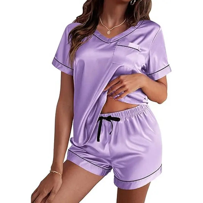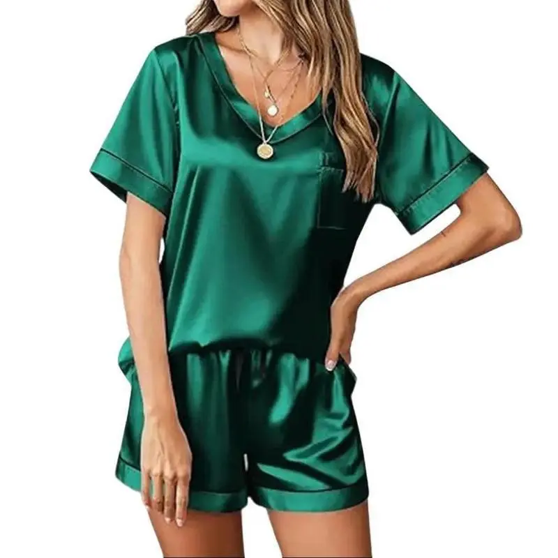 Soft Silk Pajama: satin pajamas set made of 95%Polyester+5%Spandex, soft, lightweight and breathable. Not easy to wrinkle and fade Short Sleeve Top: V neck, soild color, smooth satin top with chest pocket. The loose cut can show your body curve while giving you a burden-free wearing experience Elastic Waisted Bottoms: Very soft and stretchy shorts with drawstring. Loose fit design to ensure you sleep very comfortably Perfect Gift: Suitable for sleepwear, loungewear or daily wear. Great Present for Valentine's Day, Bridal Party, Honeymoon Vacation and Anniversaries Gift Kindly Remind: silk satin pajamas set are luxuriously stylish & soft to the touch! Washable with laundry bag or similar color clothing. Do not bleach,dry low.Gently press with a warm iron to modify packaging wrinkles before first time wear