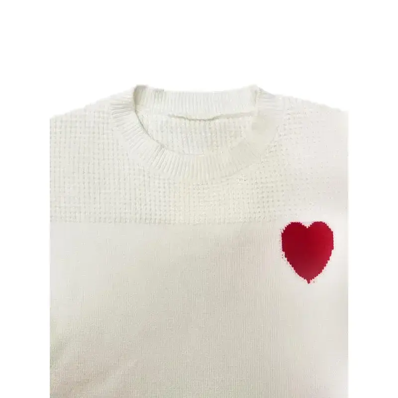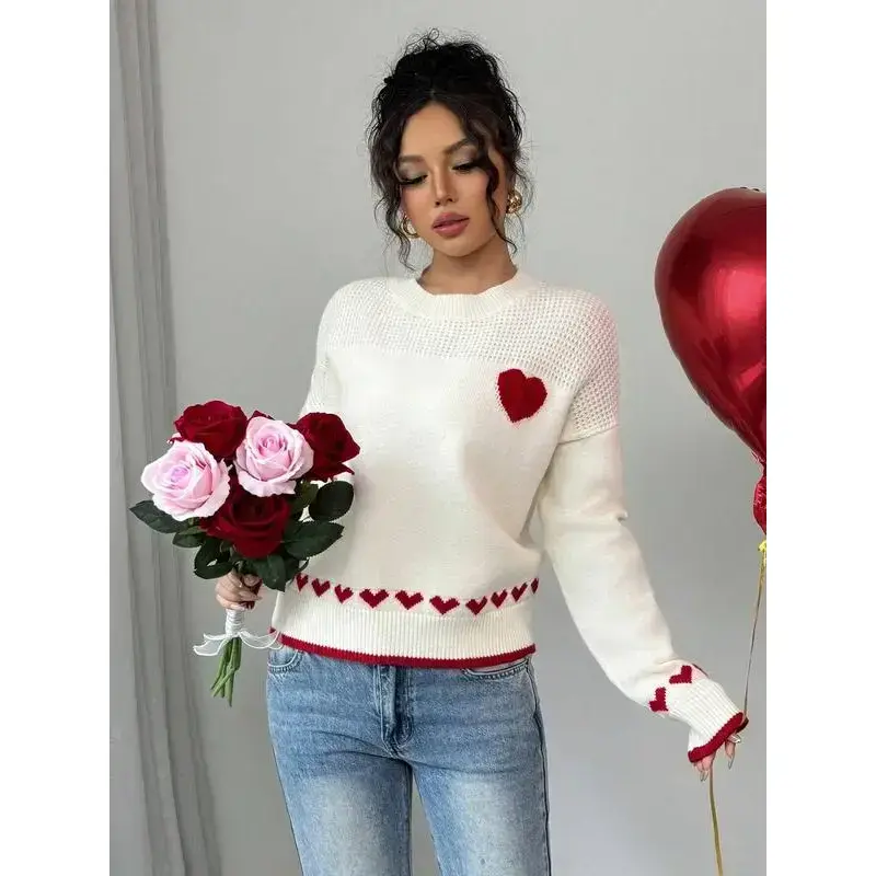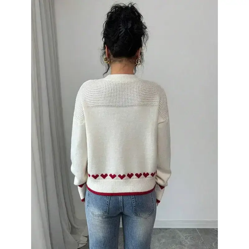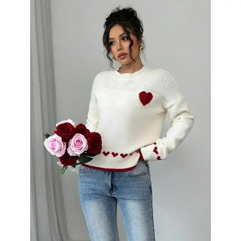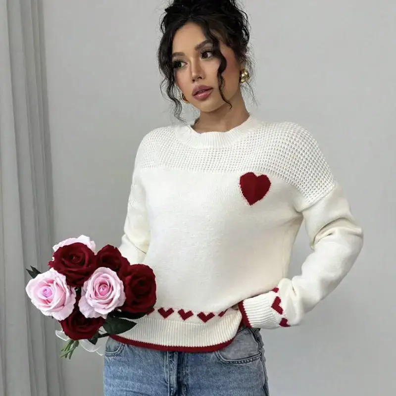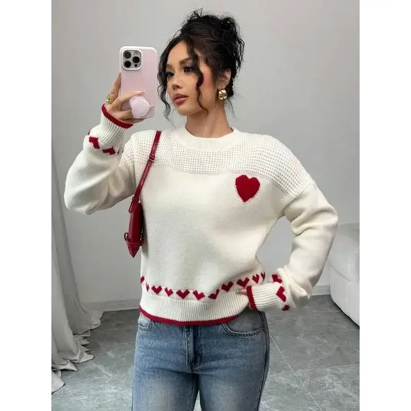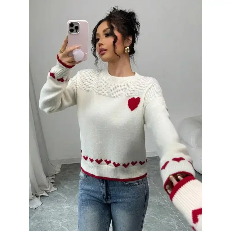 Women's Heart Print Knit Sweater, Slim-Fitting Round Neck Pullover, Casual Fashion for Fall & Winter, Perfect for Daily Wear