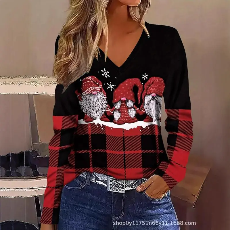 Women's Elegant Flocked Christmas Snowman Print V-Neck Sweater-Effect Long Sleeve Blouse - Cozy Winter Warmth, Machine Washable, Red & White Snowflake Pattern, Casual to Formal Holiday Party Outfits, Festive Winter Sweater Top with Fleece Lining, Medium S