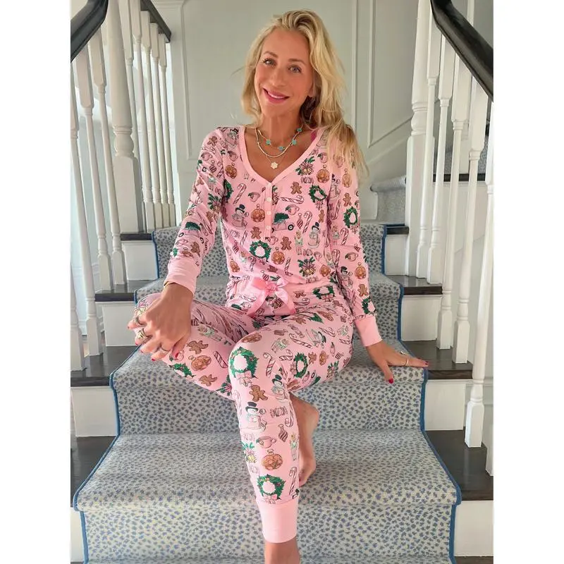 Our beloved Pink Gingerbread PJs are back and better than ever! This season, we’ve reimagined them with a comfy jogger style, making them perfect for cozy nights in. Made from our signature soft fabric, this adorable set features festive gingerbread prints on jogger pants paired with a long-sleeve V-neck Henley top. Whether you’re lounging at home or hosting a holiday movie night, these jammies are the perfect way to spread holiday cheer—in PINK! Color: Pink with gingerbread and holiday-themed design Material: 90% Polyester / 10% Spandex Sizes: Available in women's sizes XS to 3XL Fit: These pajamas fit true to size. Jordann is 5'8" and wearing a medium. Care Instructions: Machine wash cold, tumble dry low Celebrate the holidays in the cutest PJs ever and bring some festive cheer to your loungewear collection. Grab yours now before they sell out!