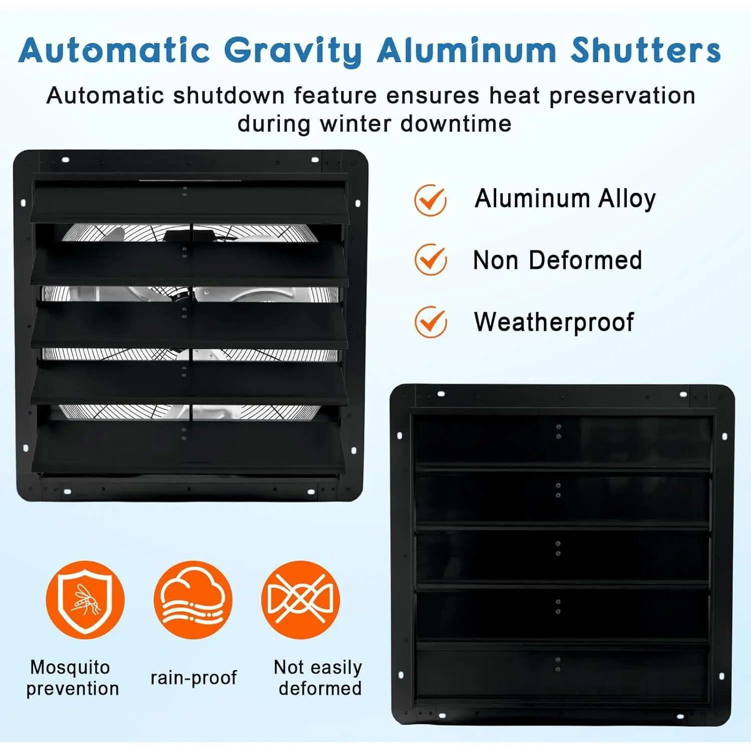 【Corrosion-Resistant Construction】: Crafted with premium aluminum for both shutters and blades, our Shutter Exhaust Fans are designed to withstand harsh environments. They resist water and heat, ensuring a long lifespan while preventing rust for reliable, long-term operation.