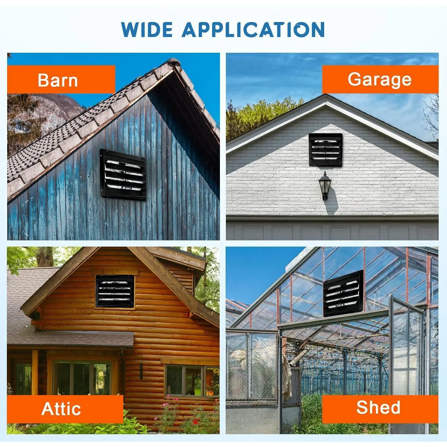 【Versatile Multi-Purpose Functionality】: Designed to effectively eliminate heat, water , dust, and odors, the Shutter Exhaust Fan is perfect for a wide range of environments. Ideal for use in attics, workshops, garages, factories, warehouses, barns, and greenhouses, it provides comprehensive ventilation solutions for both residential and commercial spaces