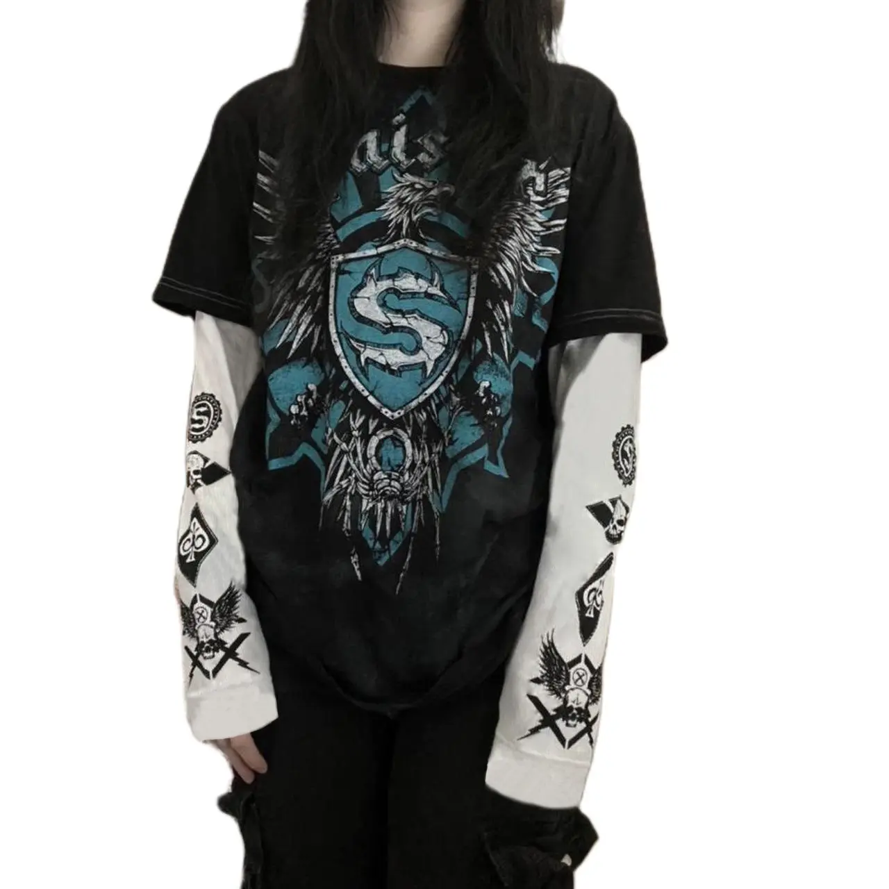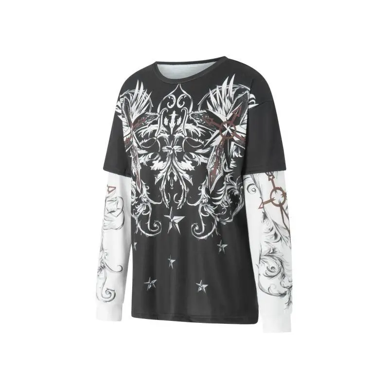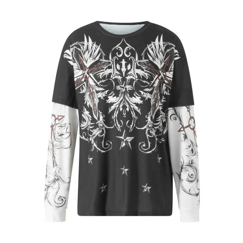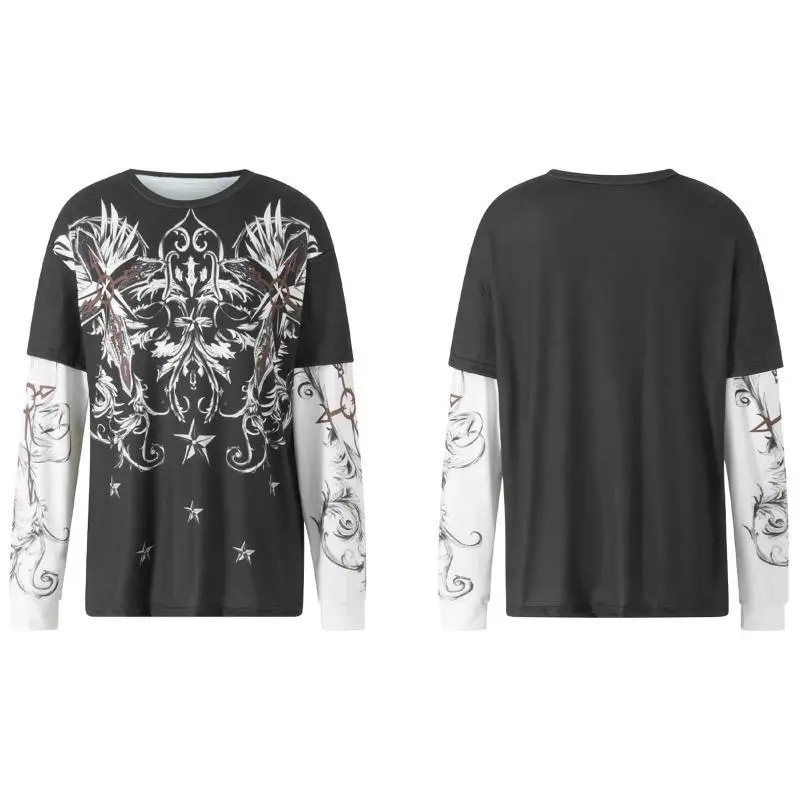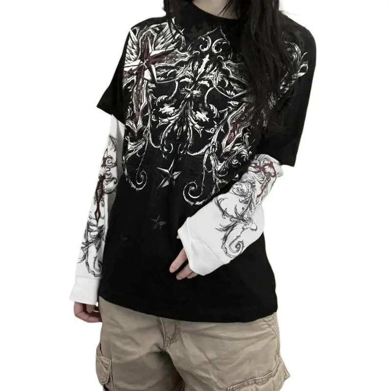 Women Fake Two-Piece T-Shirts,Y2K Vintage Graphic Print Round Neck Long Sleeve Shirts Fashion Gothic Loose Casual Streetwear
