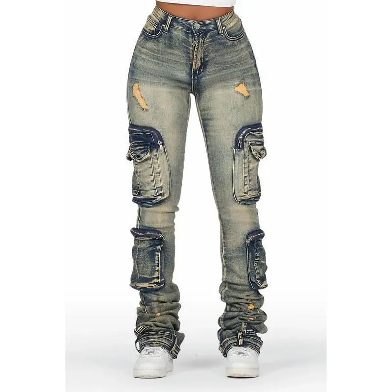 A trendy pair of super stack cargo jeans for women in tinted dark wash. Designed with premium stretch fabric and extra long legs for the perfect pair of streetwear jeans. Zip fly with button closure 7-pocket build High-waisted silhouette Fitted through the hip Flare leg openings Stretch waistband Super stacked construction 46" inseam.