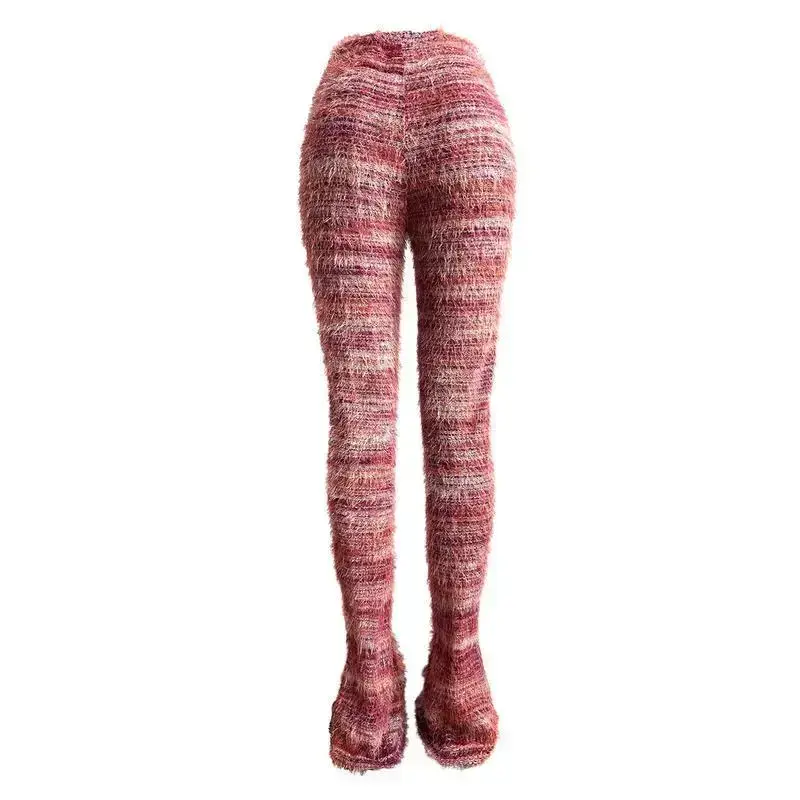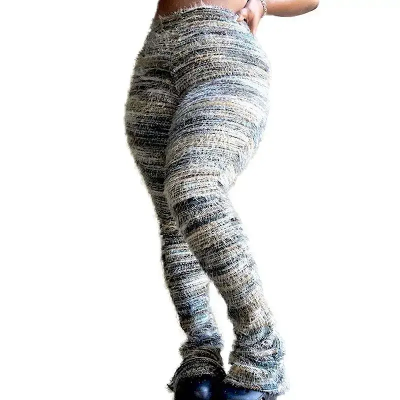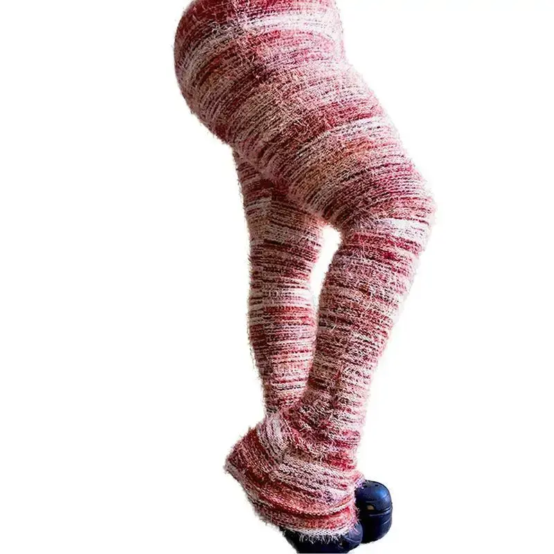 Women's Minimalist Striped Print Flare Leg Fuzzy Sweater Pants, Casual Wear, Fashion Street Style Comfort Knit Bell Bottom Trousers, Women's Basic Knitwear, Pants for Women, Clothes Women, Fall Outfits Christmas Blue Womenswear
