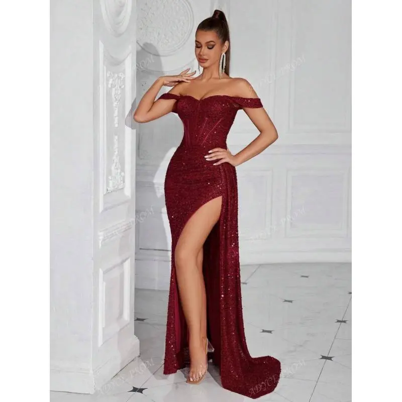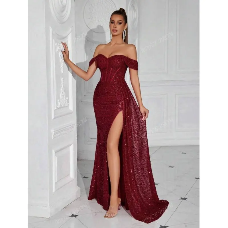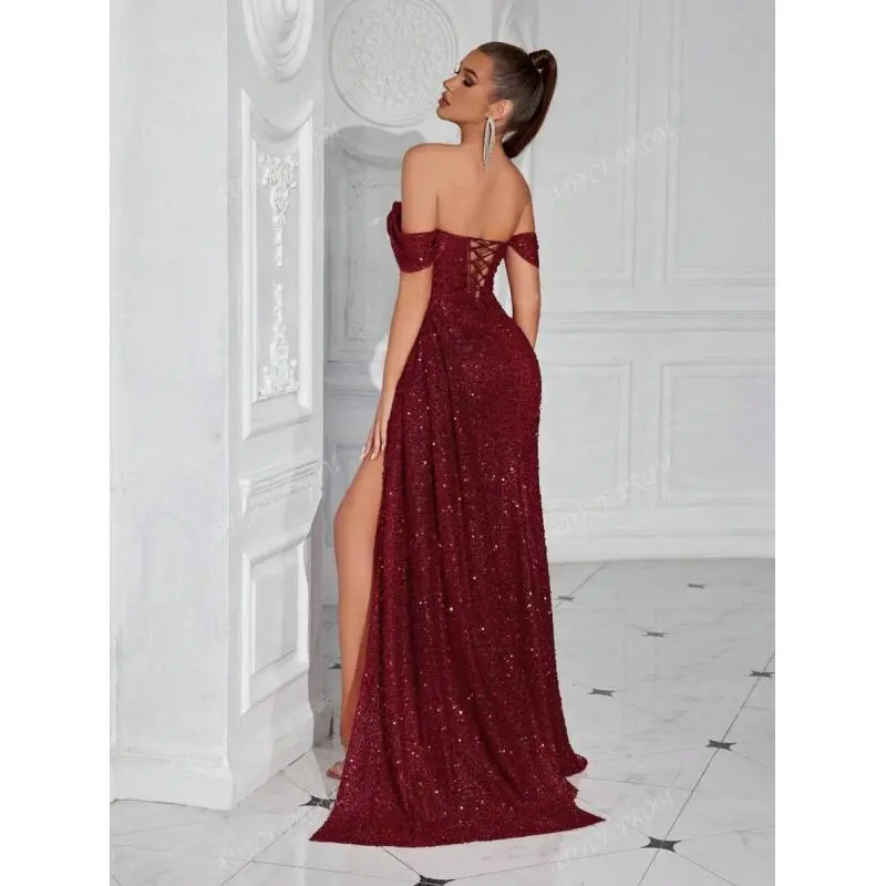 Neckline:OfftheShoulder Occasion:Party,Formal&Evening,WeddingGuest,Prom,Homecoming WaistLine:HighWaist Body:Lined SleeveType:RegularSleeve HemShaped:Slit Festivals:Christmas,ThanksgivingDay,Back-to-School,Valentine'sDay Details:Split,FittedWaist PatternType:Plain,AllOverPrint Color:Burgundy Style:Elegant,Glamorous,Party Sleevelength:sleepveless Type:Bodycon FitType:SlimFit Length:Maxi Material:Sequins Composition:95%Polyester,5%Elastane Lining:95%Polyester,5%Elastane CareInstructions:Machinewashorprofessionaldryclean Sheer:No FabricElasticity:SlightStretch ?WhyYou’llLoveOurCollection?