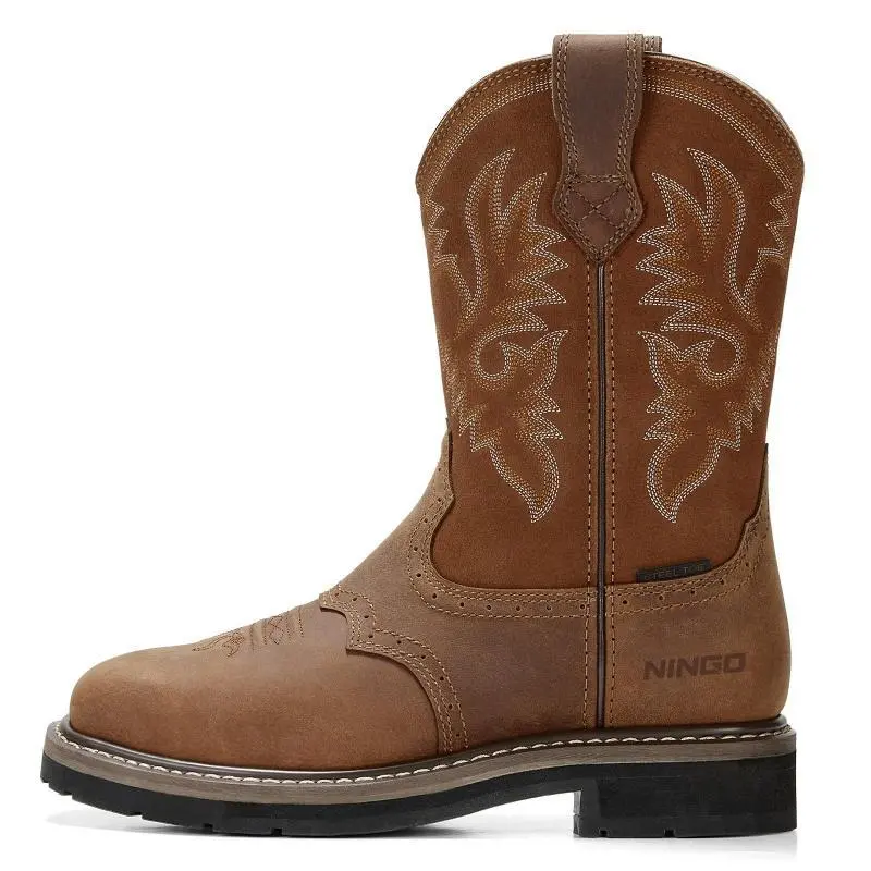 Insole Material:RubberBrine Material: RubberUpper material:LeatherShoe Width:MediumFeature:Lightweight,Breathable,Stain Resistant,Slip ResistantToe Shape:Square ToeSeason:All SeasonsOccasion:OutdoorsMaterials:Rubber,Leather Traditional Western style meets modern comfort.The neutral tones design makes them versatile, these boots you can dress up or down.The supportive cushioning and stability tech make them ideal for construction, warehouse, factory, ranch, barn, or farm work. RELIABLE DURABILITY: Traditional Goodyear Welt Construction is the in terms of durability, solidity, water-resistance, and longevity.Full Grain Leather.Oil and slip-resistant rubber lug outsole to safely keep footing in slippery conditions and to offer extra abrasion-resistant performance in your work.Additionally, these mens pull on work boots equipped with waterproof membrane with moisture-wicking mesh lining that provides completely water protection. ANTI-FATIGUE & COMFY: Comfort system with steel shank support and shock absorption that return energy back to ensure the reduction of muscle fatigue in feet and legs.The wide-square toe and removeable GEL padded footbed (on heel) for your all-day long comfort.Pull tabs allows for pull-on, kick-off ease. ALL-AROUD PROTECTION: These boots were designed to provide you with excellent job performance for all-around protection.Steel-toe protects against impact and compression (ASTM F2413-18 M I/75 C/75).90-degree heel offers added supports for extra stability in wilderness.Ideal for all surface types, oil- and slip-resistant, built for the hard-working man.ASTM F2413-18 EH rated. PLEASE READ THE SIZE CHART CAREFULLY AND CHOOSE THE RIGHT SIZE BEFORE BUYING! We offer One-year!