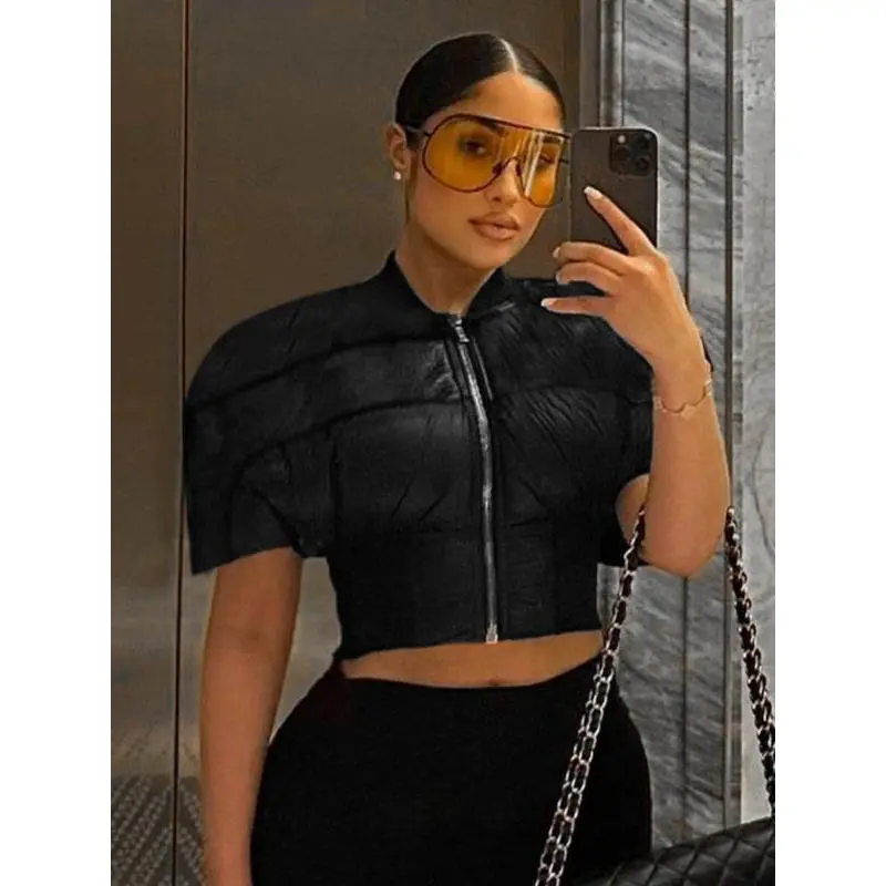 Women's Solid Puff Sleeve Zip Up Crop Quilted Crop Jacket, Casual Fashion Tops, Baseball Collar Short Sleeve Outerwear for Daily Outdoor Wear, Fashion Jacket, Women Clothing for Fall & WinterGiftGift