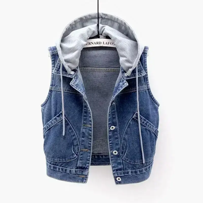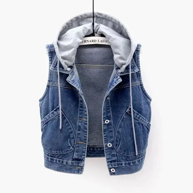 Sleeveless Jeans Jacket Women Korean Fashion Hooded Vests Jean Short Waistcoat Large Size Cotton Zipper Denim Vest Female