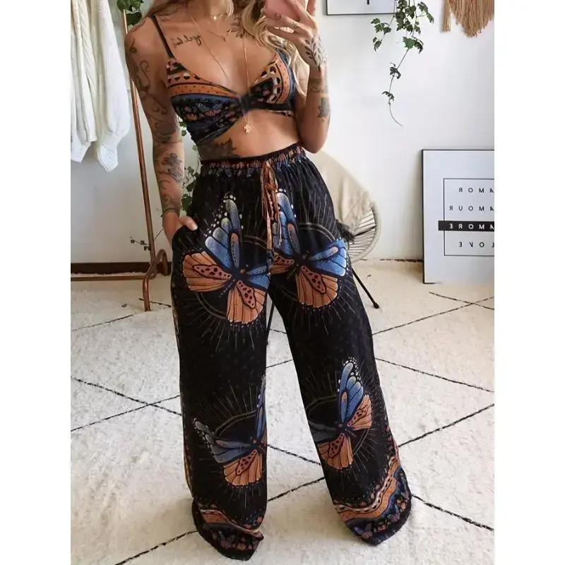 🌟 Sexy Butterfly Print Two-piece Set 🌟 Elevate your wardrobe with this backless crop halter top and wide leg pants outfit. Crafted from 95% polyester and 5% spandex, this set offers micro elasticity for comfort. The butterfly print adds a touch of allure, perfect for spring/summer. Low waist design ensures a flattering fit. Machine wash or opt for professional dry cleaning. Originating from Guangdong, China, this set is a must-have for your collection. Product Details 📝 Care Instructions 🧺 Additional Information 📚
