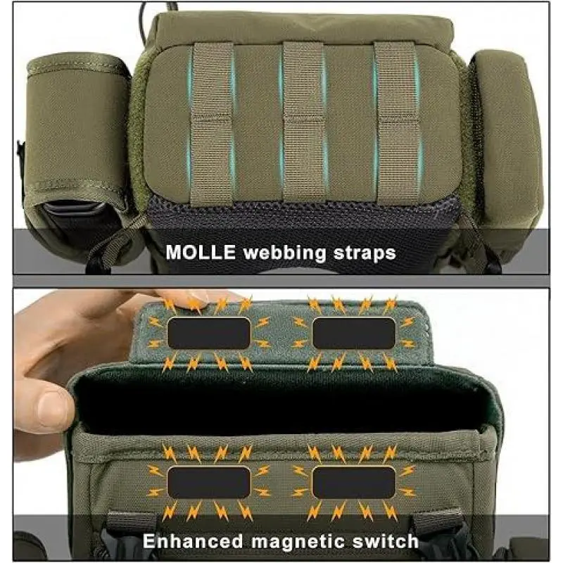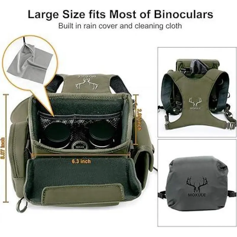 Warranty Duration:12 MonthsWarranty Type:Supplier WarrantyMaterial:NylonProduct Type:Binocular Harness Chest PackQuantity Per Pack:1 Product Type:Binocular Harness Chest PackMaterial:NylonWarranty Duration:12 MonthsBatteries Included:NoQuantity Per Pack:1Warranty Type:Supplier Warranty Binocular Harness Chest Pack: Waterproof Bino Case with Rangefinder Pocket for Birdwatching and Hiking MOXULE Binocular Harness Chest Pack About this item Dimensions: Product size- 8.46"Height * 10.61"Length * 4.34"Width; Storage Size- 8.07"Height * 6.3" Length * 2.95"Width.Our bino harness chest pack has a larger interior space, suitable for the vast majority of binoculars on the market. Portable Multi Pockets: 1 main large compartment with 2 little mesh storage, 1 detachment rangefinder pouch and side pocket,1 front phone pocket,1 layer mesh space,1 rain cover pocket;The bottom of the binocular harness chest pack is equipped with molle straps. Rain Cover and Wide Cloth: This bino bag comes with a rain cover and a cleaning cloth,helping you travel even on rainy outdoor days and clean lens stains at any time. Strength Magnetic and Wider Bino Harness Straps: Our binocular chest harness pack taking into full consideration the feelings of every outdoor person, we have adopted stronger magnetic switches to ensure the storage and pick up of the binocular;At the same time, our pack's back strap adopts a wider design, combined with breathable mesh material, allowing you to use it for a long time without effort. Camo Material: 3-Layer brush tricot polyester body make this pack more durable and can prevent splashing, internal design let it will not noisy.At the same time, it ensures lightweight weight, while retaining space and minimizing outdoor neck pressure. Green&Wolf Brown Material: 1000D treated nylon body make this pack more durable and can prevent splashing,internal design let it will not noisy.At the same time, it ensures lightweight weight, while retaining space and minimizing outdoor neck pressure.