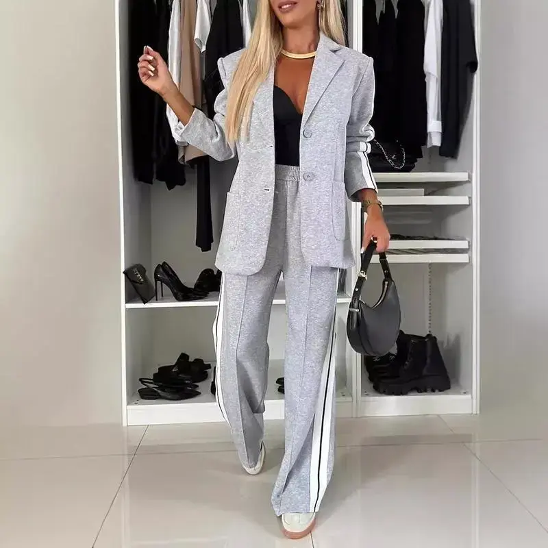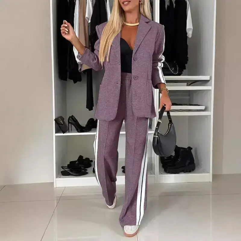 Upgrade your wardrobe with this chic women's two-piece suit set, featuring a relaxed-fit blazer and wide-leg pants for a perfect blend of comfort and sophistication. The notched lapel design adds a modern touch, making it ideal for both business casual and formal occasions. Crafted from high-quality, breathable fabric, this set ensures all-day ease while maintaining a flattering, tailored silhouette. Whether for the office or a stylish outing, this versatile suit offers effortless elegance. Available in multiple colors to match your style. Shop now for a polished, professional look!Polyester