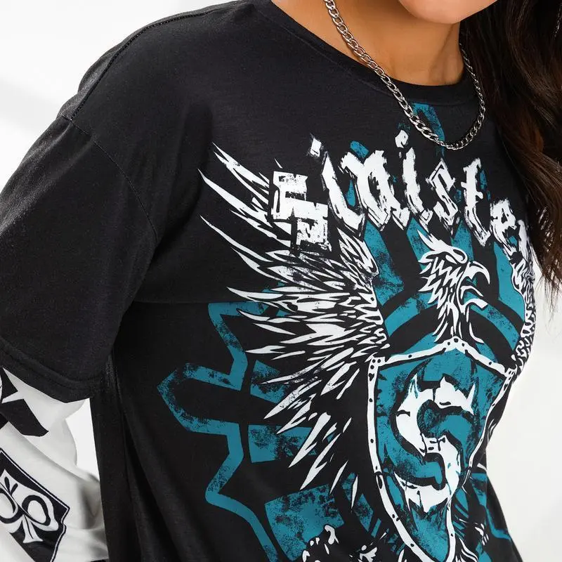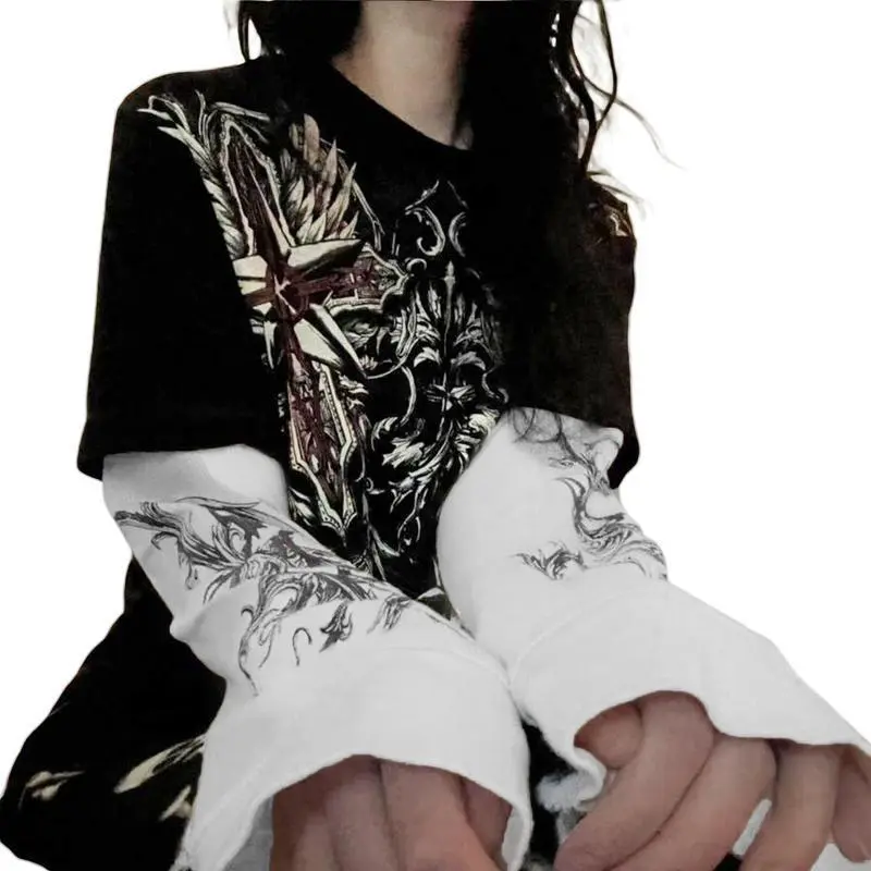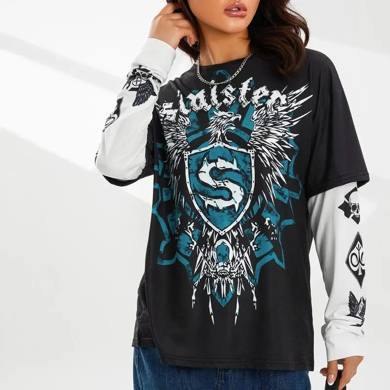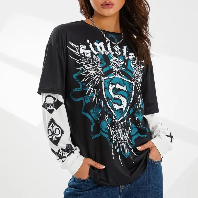 Women Fake Two-Piece T-Shirts Vintage Graphic Print Round Neck Long Sleeve Shirts Fashion Gothic Loose Casual Streetwear ? Size(cm) S Length: 67 Bust: 108 Sleeve Length: 58 Shoulder: 53 M Length: 68 Bust: 112 Sleeve Length: 59 Shoulder: 54 L Length: 69 Bust: 116 Sleeve Length: 60 Shoulder: 55 ? Size(inch) S Length: 26.38 Bust: 42.52 Sleeve Length: 22.83 Shoulder: 20.87 M Length: 26.77 Bust: 44.09 Sleeve Length: 23.23 Shoulder: 21.26 L Length: 27.17 Bust: 45.67 Sleeve Length: 23.62 Shoulder: 21.65 ? Specification: Name: Women Fake Two-Piece T-Shirts Gender: Women Material: Polyester Collar: Round Neck Sleeve length: Long Sleeve Pattern: Graphic Print Size: S/M/L ? Package Contents 1 x T-shirts ? Friendly Tips: 1. Please kindly allow a 2-3% difference according to manual measurement. 2. Please check the measurement chart carefully before you buy the item. (1 inch = 2.54 cm) 3. Please note that a slight color difference should be acceptable due to the light and screen. Thanks. ? Promise If the product has any quality problems, please feel free to contact us, we will help you solve the problem as quickly as possible.