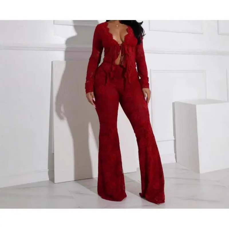 Size Type:Plus SizeComposition:70%(Inclusive)-80%(Exclusive),SpandexSeason:SpringPattern:Plants Size Type:Plus SizeComposition:Spandex,70%(Inclusive)-80%(Exclusive)Style:Street,Street Style,Pants SuitSeason:SpringPattern:Plants -red lace set with V-neck cardigan & high-waisted flared pants. Delicate sheer paneling and crisscross back detailing create elegant contrast, styled with gold chain accents for # NightOutStyle. The contoured silhouette flows through waist-defining tailoring, for date nights or cocktail parties. Breathable knit fabric allows movement while maintaining sophistication during evening events. 's trending # LaceFashion pairing transitions seamlessly from rooftop bars to gala dinners. Romantic cutout patterns align with viral # EveningOOTD content, styled with strappy heels for leg-lengthening effect. Machine-washable luxury fabrics maintain intricate lacework through multiple wears.
