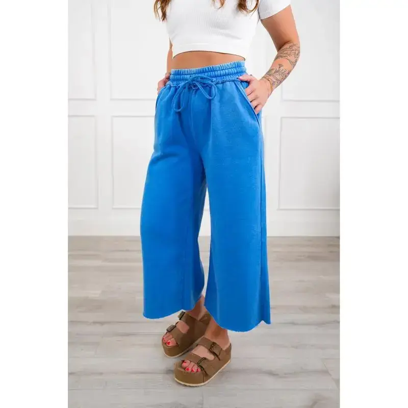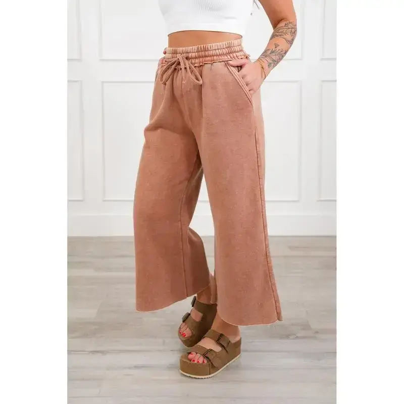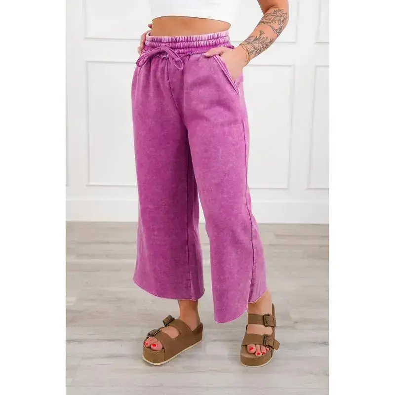 Details: * Acid wash for that lived-in look * Super soft fleece inside * Wide leg cut with raw hem * Functional drawstring waistband and side pockets * Multiple color choices Get ready to jump into cozy mode with these fabulous fleece palazzo sweatpants!The wide leg cut and raw hem keep things fresh and playful, while the functional drawstring waistband is there for those big pasta days.Pair them with a fitted tank or a slouchy graphic tee and sneakers for your ultimate off-duty look. Fit: These have a roomy true-to-size fit that drapes beautifully.The elastic waistband keeps it comfy, and deep side pockets seal the deal. Size Chart S: 2-6 M: 8-10 L: 12-14 1XL: 14W-16W 2XL: 18W-20W 3XL: 22W (long dark brown hair) is wearing the small. She has a curvy figure. Measurements: Size S - Waist: 26" Inseam: 22.5" Size 1XL - Waist: 31" Inseam: 23" Fabric: 60% Cotton, 40% Polyester