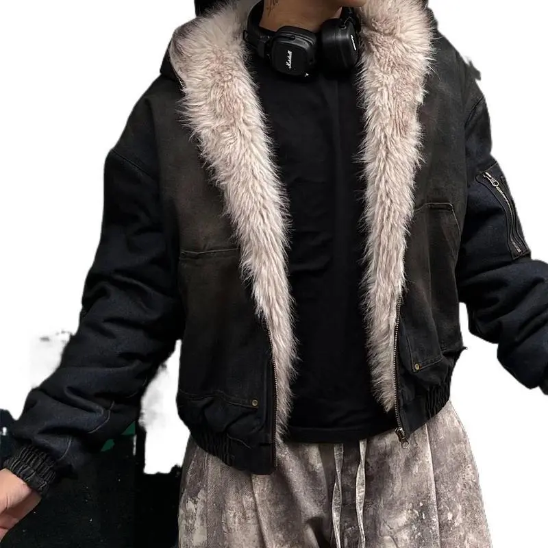 Men's American street washed denim padded cotton jacket, winter fleece - lined outerwear, men's wasteland - style cotton coat Patchwork Hooded men leatherjacket couple sweatshirt