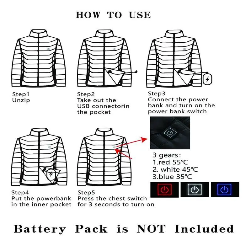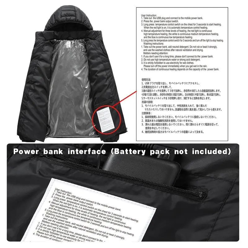 ��?��Battery pack not included�� This heated jacket is designed for comfort and warmth with 9 heating zones and 3 temperature settings. It connects to any 5V/2A USB power bank (sold separately). Please note: the power bank is not included in the package. ?? Future Preventive Measures: ��?All future listings will clearly display ��Power bank not included�� in both the title and description. ��?We have added internal product inspection steps to check zippers and heating connections before shipment. ��?We will provide after-sales guidance to help buyers correctly connect and operate the heating feature.