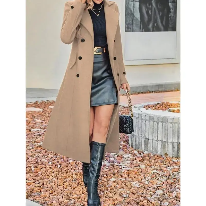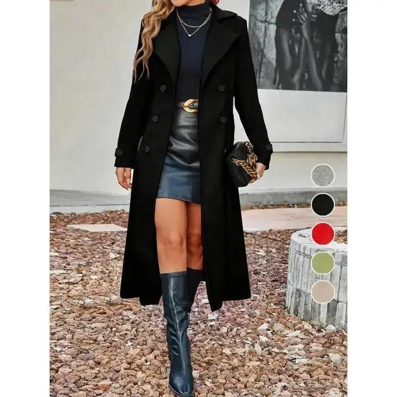 Women Winter Wool Blend Mid-Long Coat Notch Double-Breasted Lapel Jacket Outwear, Women's Solid Double Button Lapel Woolen Coat, Elegant Long Sleeve Long Coat for Women Outerwear Grey
