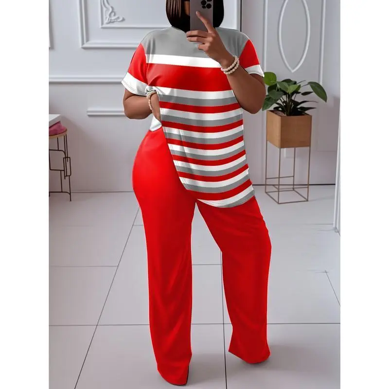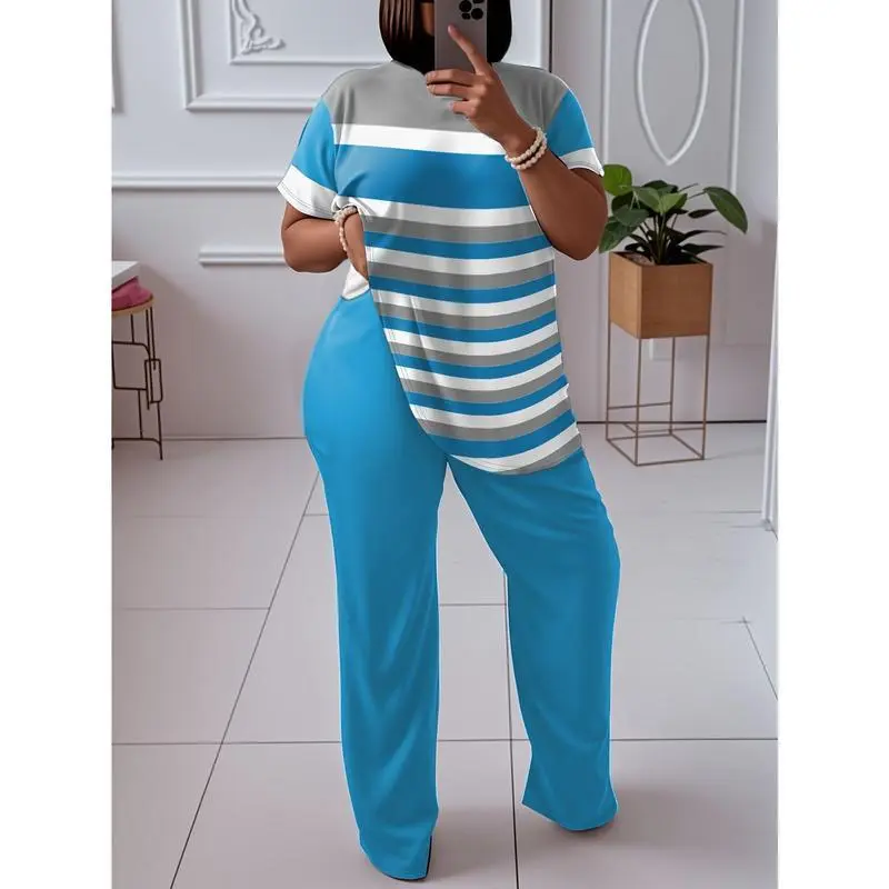 Elevate your wardrobe with this stylish and versatile two-piece set, designed for comfort and style. Two-Piece Set: This set includes a round neck top and straight pants, offering a coordinated look that pairs effortlessly with various outfits. Plus Sizes: Available in plus sizes, this set is perfect for women who appreciate a flattering fit. Striped Print: The striking striped print adds a modern touch to your outfit, making it a standout piece in your collection. Comfortable Fit: The top features a round neck and short sleeves, ensuring a relaxed and comfortable fit for all-day wear. This set is a must-have addition to your wardrobe, perfect for any occasion.