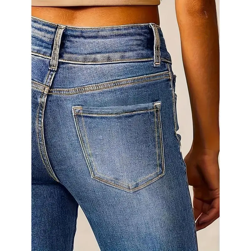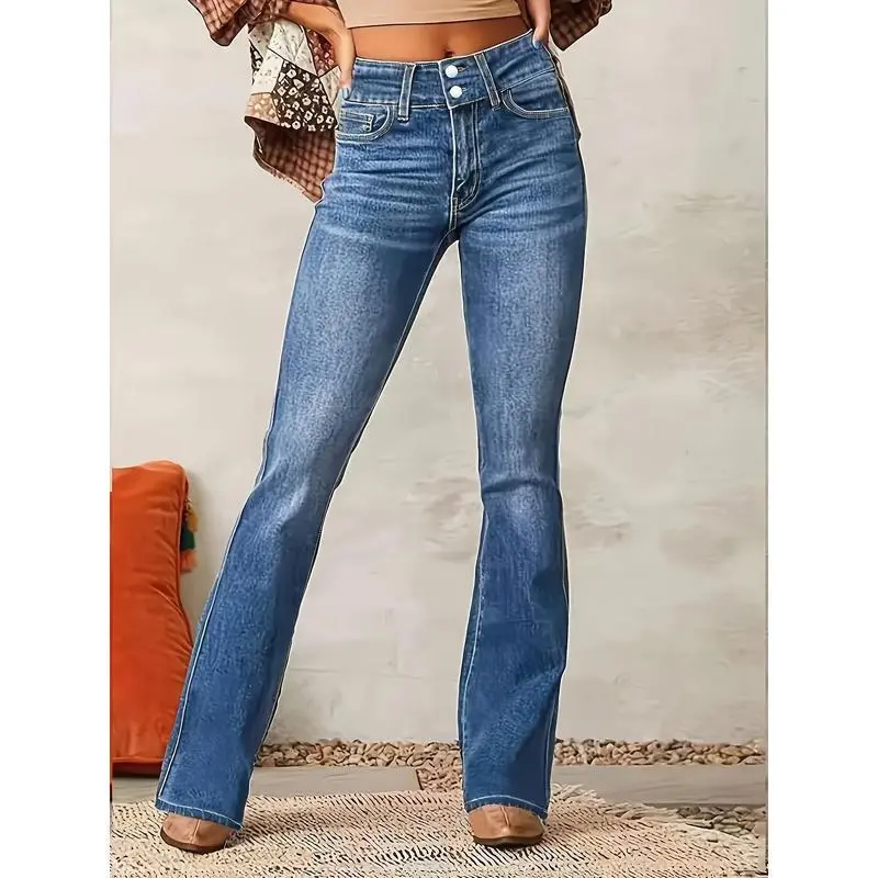 Plus Size Women's Fashionable Stretch Bootcut Jeans - Casual Double Button, Mid-Rise, Versatile Flare Leg Denim in Light Blue, Washable Machine