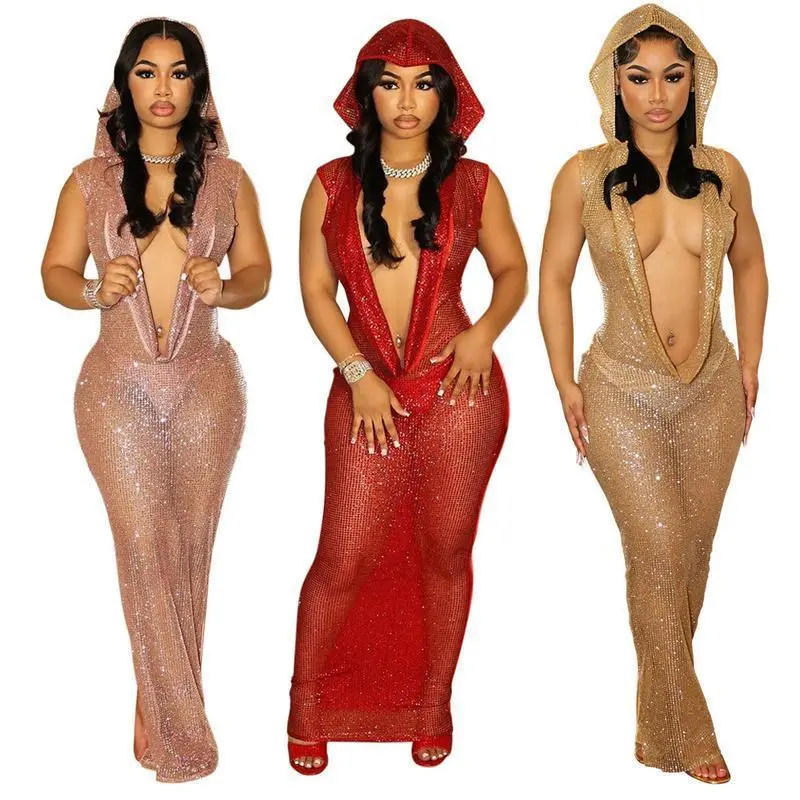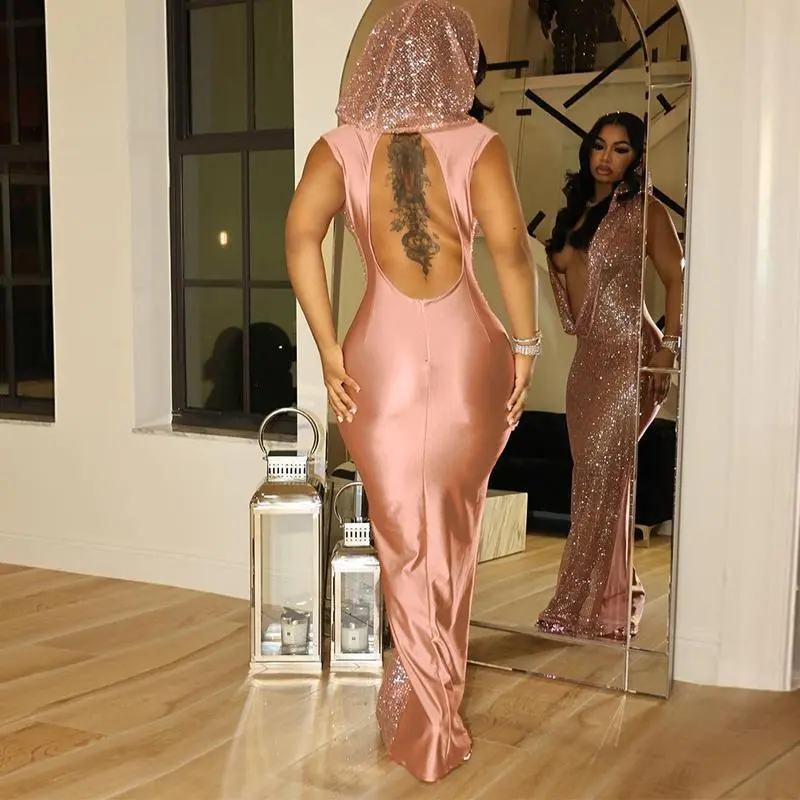 2025 New Sexy Deep V See-through Sequined Long Dress Formal Womenswear Workwear Comfort Minimalist Basic Pink Sleeveless Dance Clothing