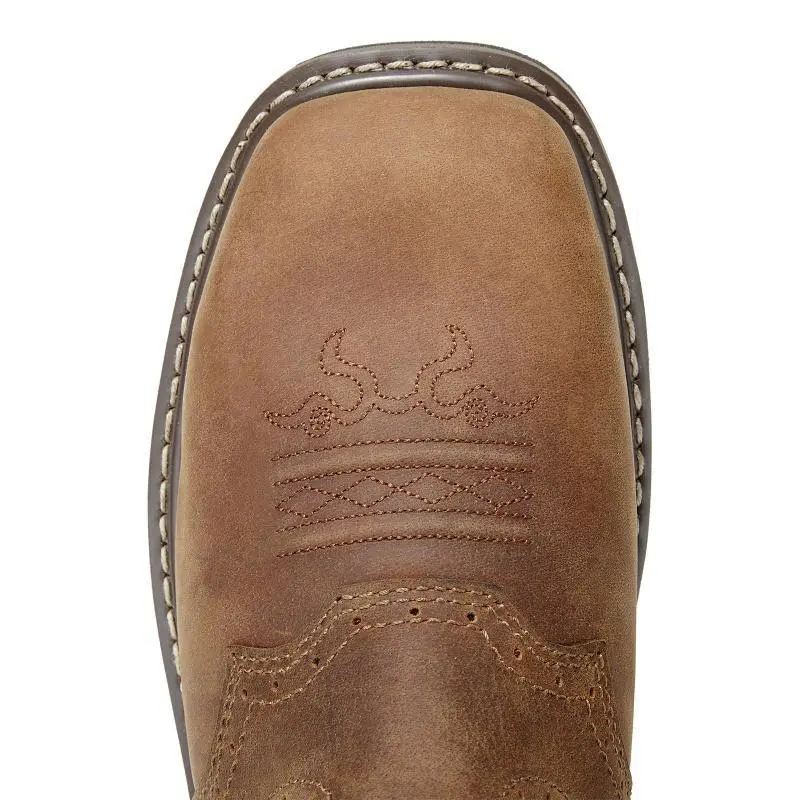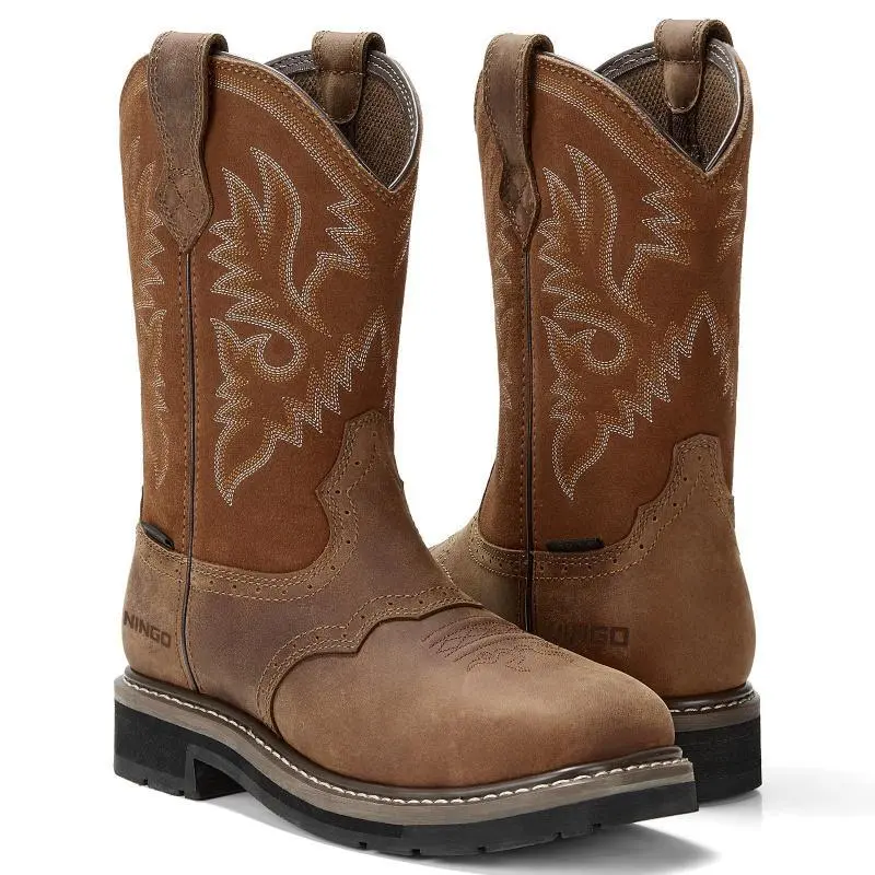 Insole Material:RubberBrine Material: RubberUpper material:LeatherShoe Width:MediumFeature:Lightweight,Breathable,Stain Resistant,Slip ResistantToe Shape:Square ToeSeason:All SeasonsOccasion:OutdoorsMaterials:Rubber,Leather Traditional Western style meets modern comfort.The neutral tones design makes them versatile, these boots you can dress up or down.The supportive cushioning and stability tech make them ideal for construction, warehouse, factory, ranch, barn, or farm work. RELIABLE DURABILITY: Traditional Goodyear Welt Construction is the in terms of durability, solidity, water-resistance, and longevity.Full Grain Leather.Oil and slip-resistant rubber lug outsole to safely keep footing in slippery conditions and to offer extra abrasion-resistant performance in your work.Additionally, these mens pull on work boots equipped with waterproof membrane with moisture-wicking mesh lining that provides completely water protection. ANTI-FATIGUE & COMFY: Comfort system with steel shank support and shock absorption that return energy back to ensure the reduction of muscle fatigue in feet and legs.The wide-square toe and removeable GEL padded footbed (on heel) for your all-day long comfort.Pull tabs allows for pull-on, kick-off ease. ALL-AROUD PROTECTION: These boots were designed to provide you with excellent job performance for all-around protection.Steel-toe protects against impact and compression (ASTM F2413-18 M I/75 C/75).90-degree heel offers added supports for extra stability in wilderness.Ideal for all surface types, oil- and slip-resistant, built for the hard-working man.ASTM F2413-18 EH rated. PLEASE READ THE SIZE CHART CAREFULLY AND CHOOSE THE RIGHT SIZE BEFORE BUYING! We offer One-year!