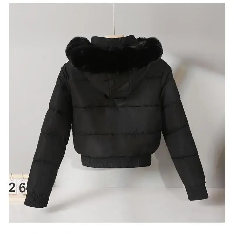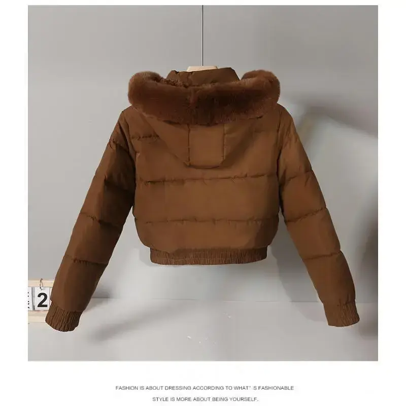 Women's Zip Up Pocket Design Shirred Waist Jacket Fuzzy Trim Fleece Lined Hooded Puffer Coat Windproof Jackets