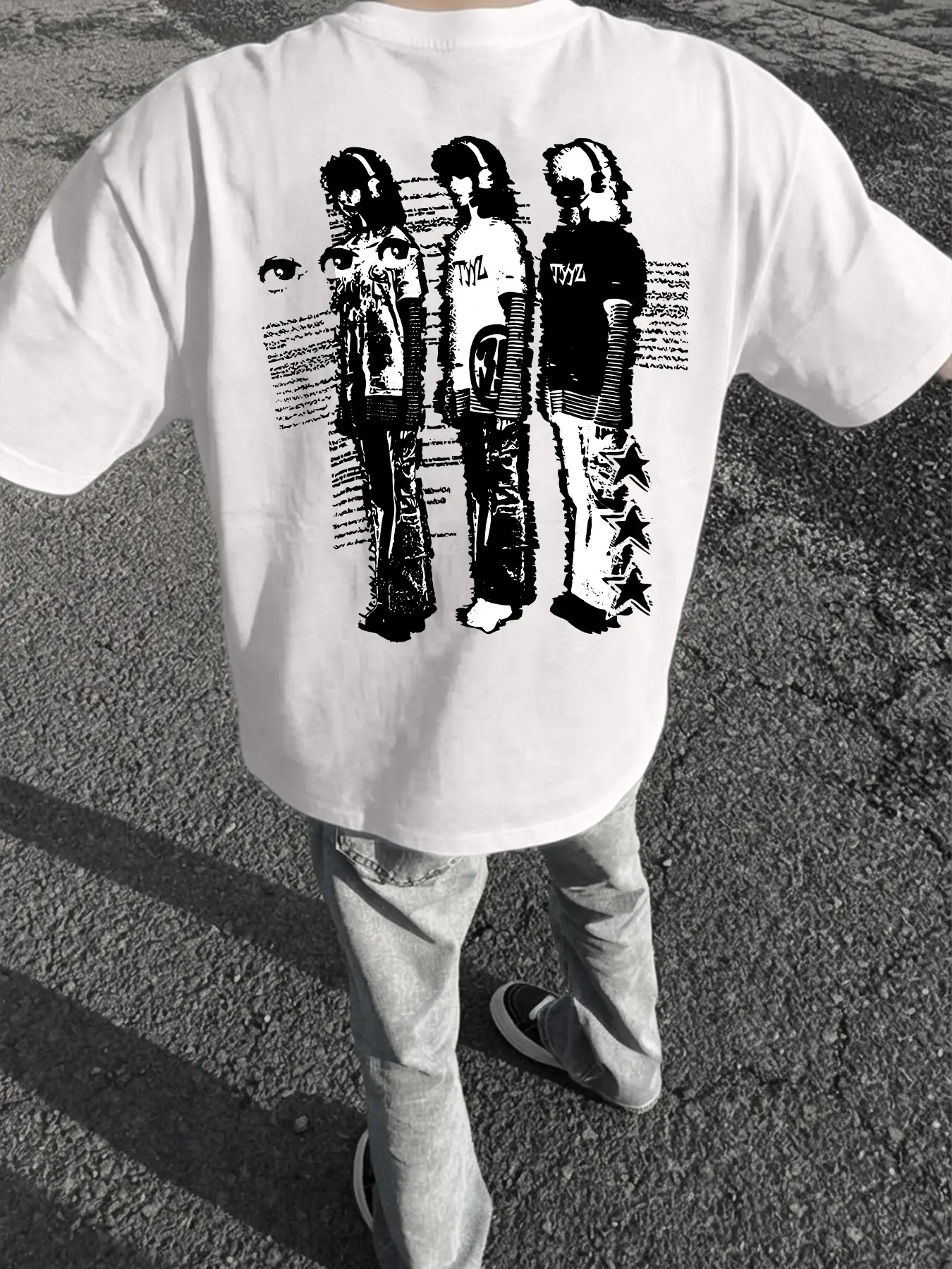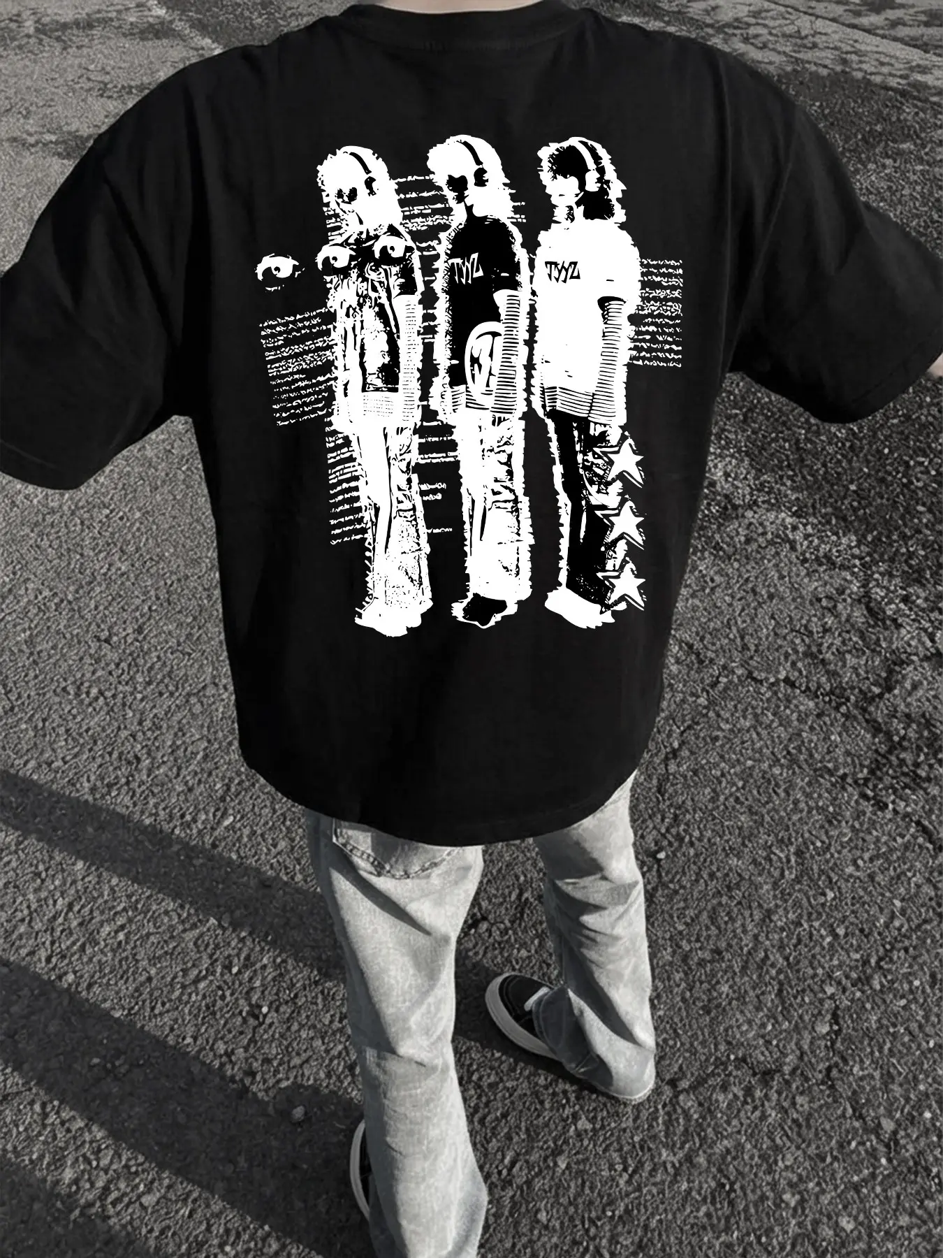 Dark Style Eye-Covering Mouth-Covering Portrait T-Shirt, American Hip-Hop Oversize Loose Short Sleeve, Trendy Limitless Statement Top