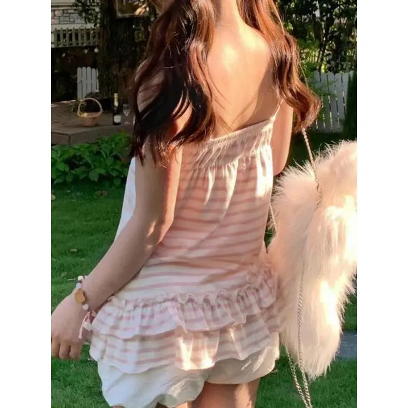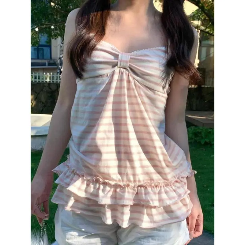 Sweet Striped A-Line Ruffle Spaghetti Strap Vest, Y2K Style Pleated Twist Fashion Top, Tight-Fitting Fall & Winter Women's ClothingGift