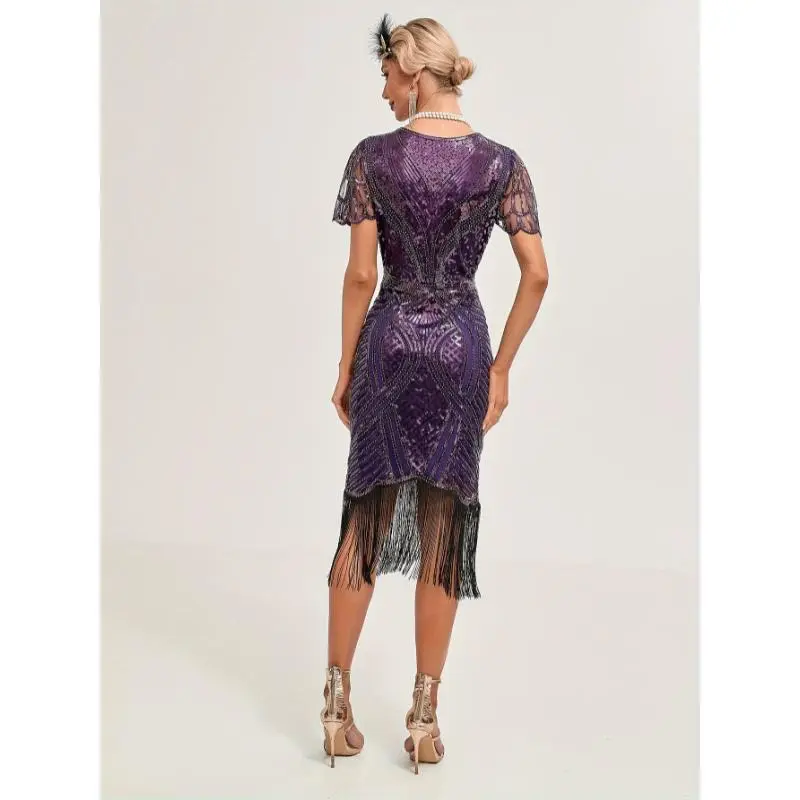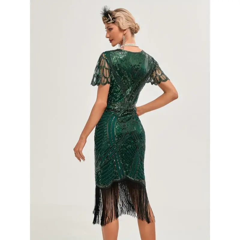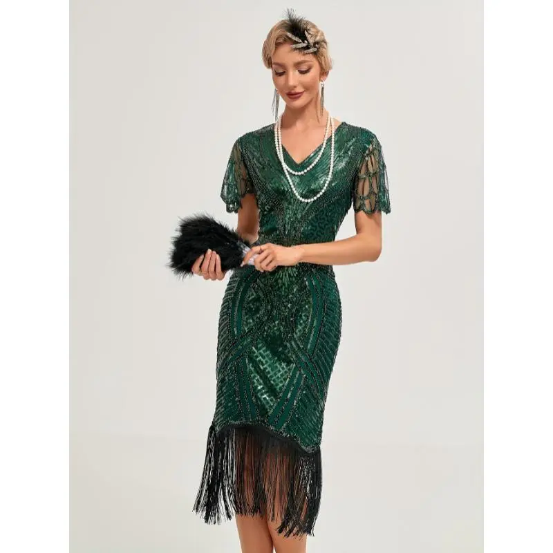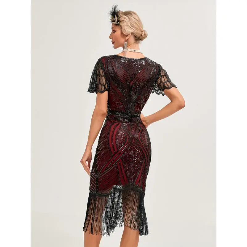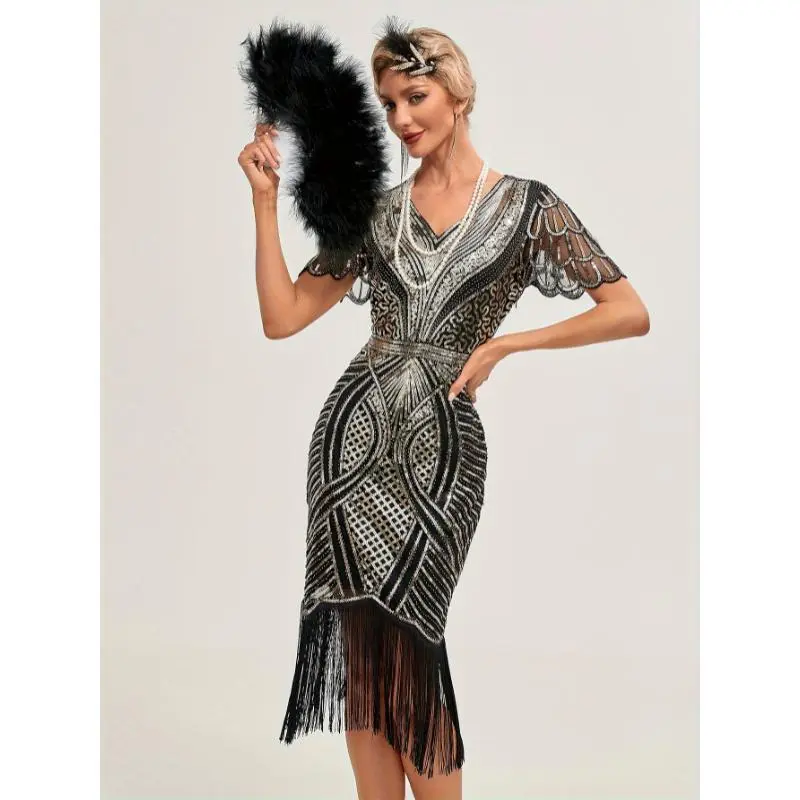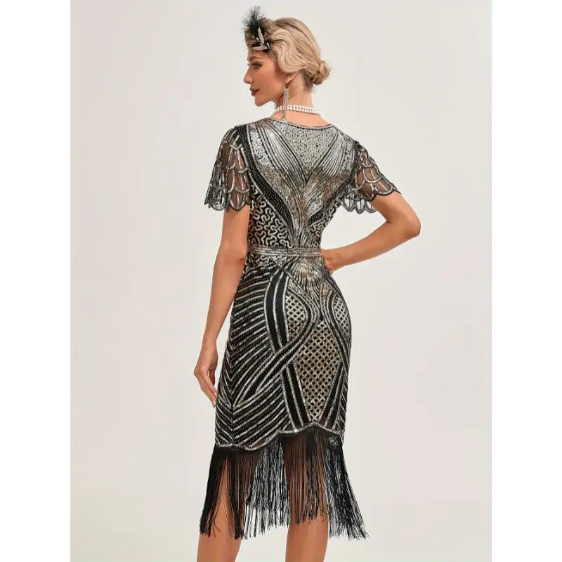 1pc Vintage Gatsby Sequin Dress, 1920s Flapper Tassel Short Sleeve Party Banquet Dance Dress, Polyester 100%, Contrast Detail, V-Neck Fitted Woven Dress for Adults - All Seasons
