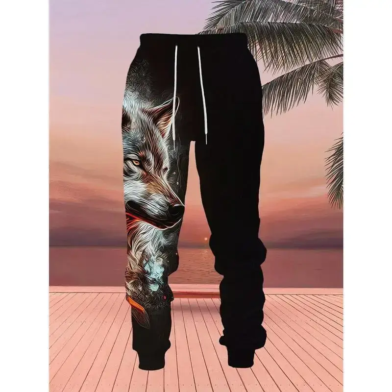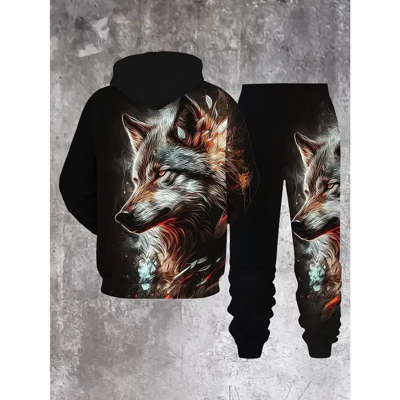 Men's wolf print hoodie and sweatpants set - casual streetwear, polyester blend, machine washable - perfect choice for spring and autumn seasons
