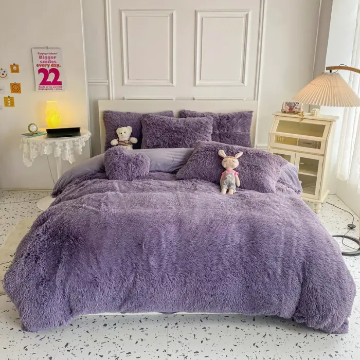 ?LUXURY AND SOFT? The front of the fluffy comforter cover is microfiber plush, which is super soft and comfortable. The is silky fabric that is delicate and -friendly, locking in warmth, gives you a warm and cosy sleep in the cold winter. ?WARM, COZY & STYLISH? This fluffy bed set brings you the ultimate comfortable sleep experience, like sleeping on a cloud so you can fully relax in your bed. The stylish solid color design adds luxury to your room and is the choice for updating your bathroom. It's also a warm for your family, friends or colleagues, making them feel your caring. ?EASY TO INSTALL? The faux comforter cover has a zipper closure at the bottom, and the metal zipper is smooth and durable, easy to disassemble; The 4 corner ties inside the plush comforter cover helps keep the quilt in place and slipping for comfortable sleeping at night. ?OPTIONAL SIZE? The black shaggy duvet cover set includes 1 x size duvet cover (90"x 90"), 2 x Pillowcases (20" x 26"), and 1 x Throw pillow cover (18" x 18"). Note: Quilts and sheets are not included. This fluffy duvet cover set comes in a variety of colors and sizes so you can choose according to your preference and bedroom style. ?CARE INSTRUCTION?The comfortable fuzzy bedding set can be machine washable in cold water, gentle cycle, tumble dry low, do not bleach, do not iron. To protect the , turn it inside out when cleaning. We recommend cleaning before first use. Please feel free to contact if you have any question, we will reply you within 24 hours and give you a satisfied answer.