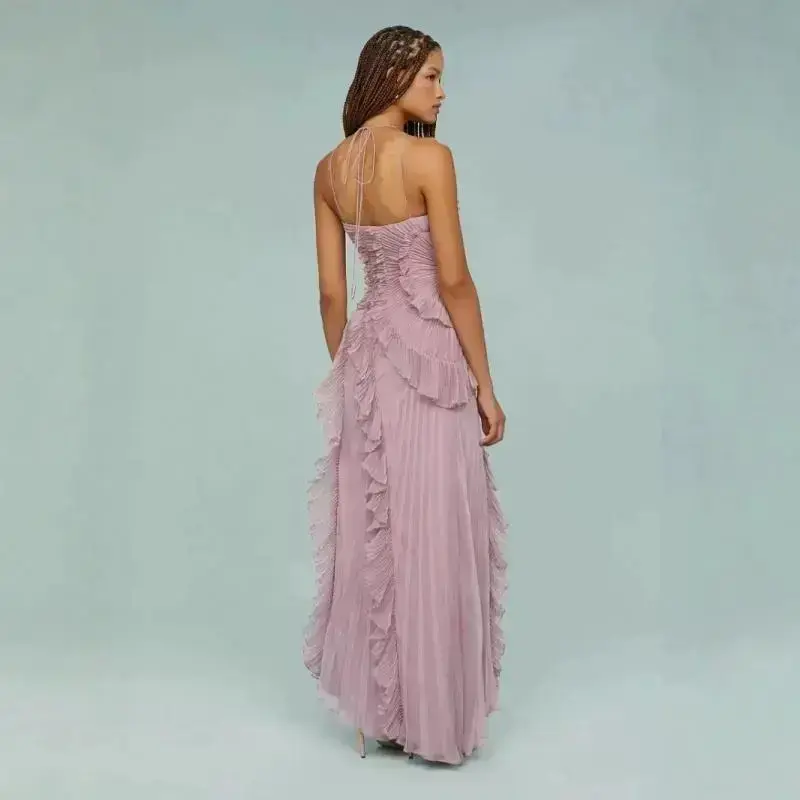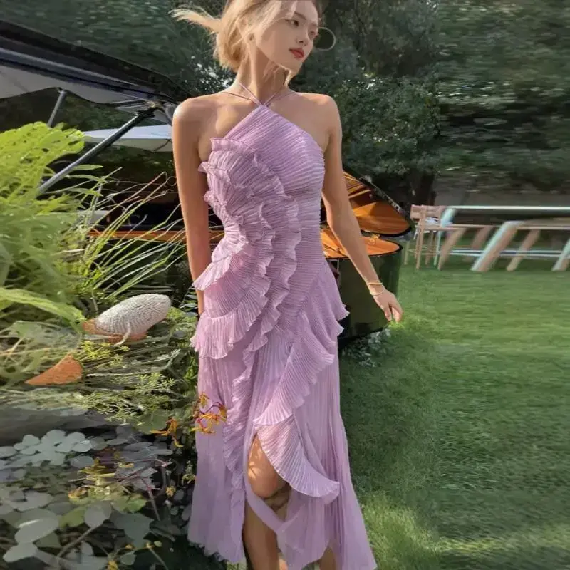High-end Chiffon Dress for Women, Ruffled Pleated Design Slimming Midi Dress