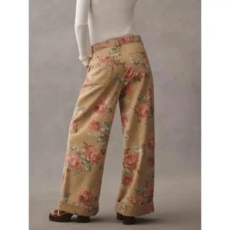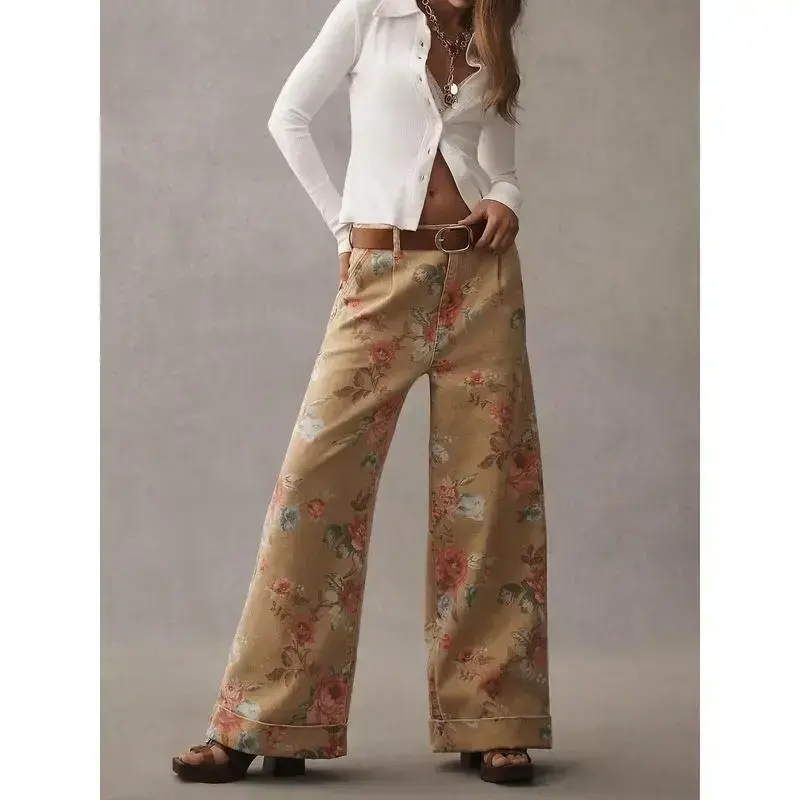 Women's Khaki Yellow Boho Floral Print Wide Leg Jeans Bohemian Print ?? Wide Leg Fit ?? Double Rolled Hem ?? Front Zip Closure ?? Year-round Wear ??