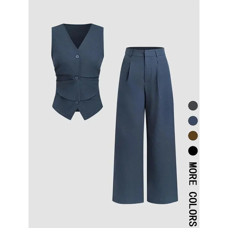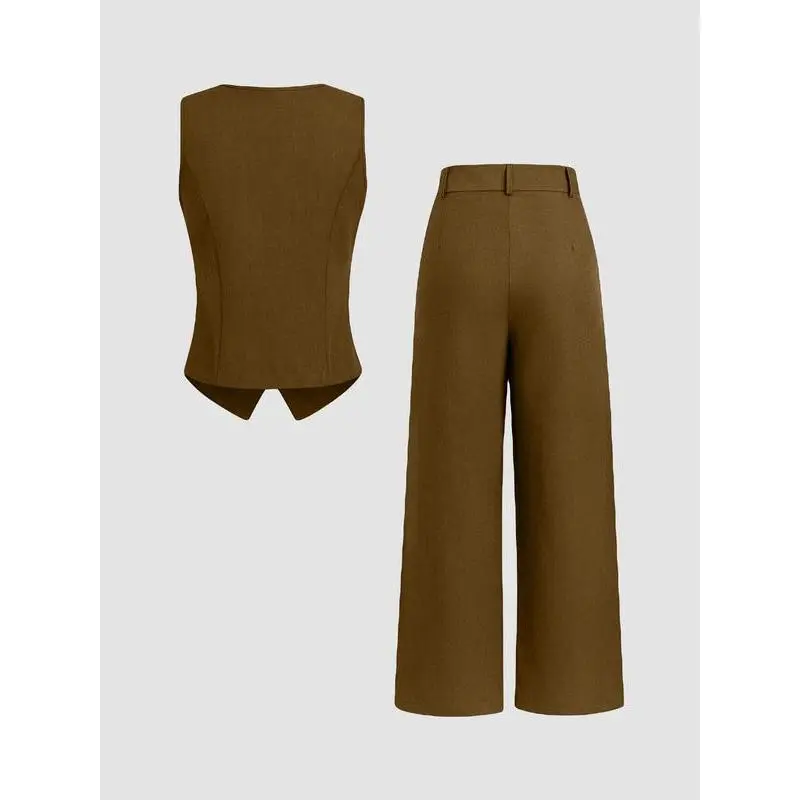 Two-piece Set Women's Solid Color Vest Blazer & Wide Leg Pants Set, Elegant Fitted Fashion Casual Two-piece Set for Daily Outdoor Wear, Women Clothing for All Seasons, Suits