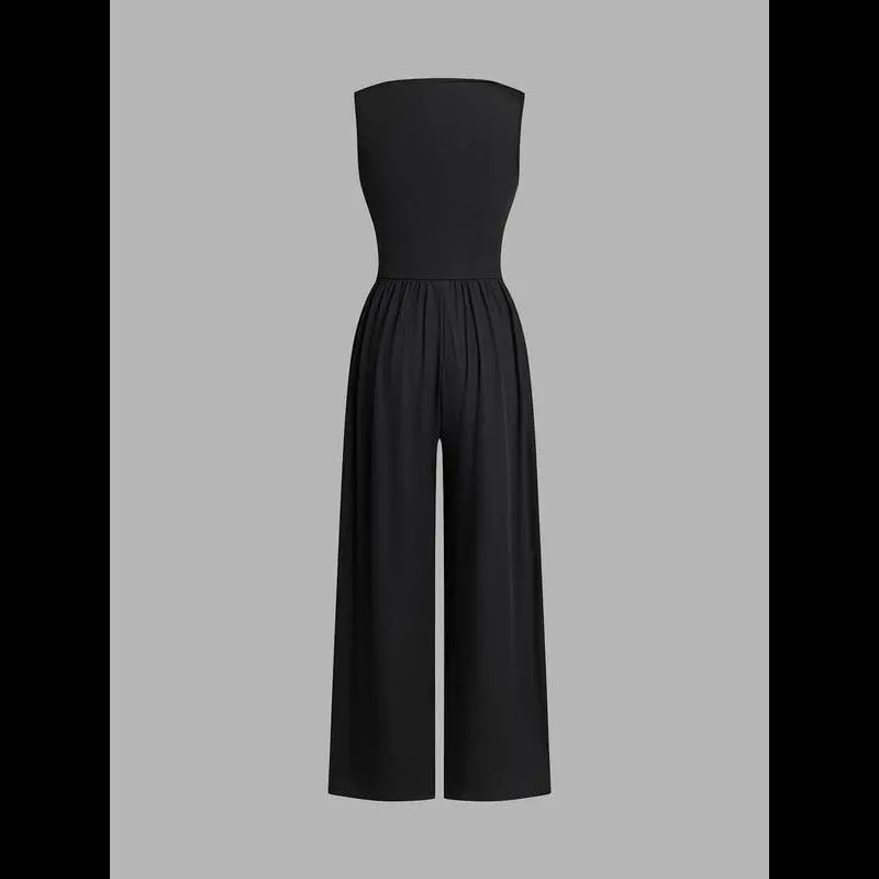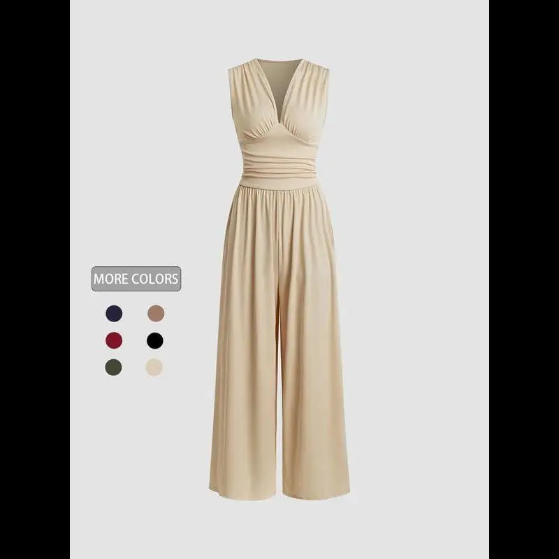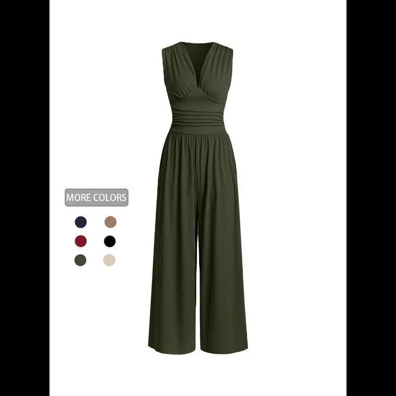 Women's Minimalist Plain Ruched Deep V Neck Wide Leg Jumpsuit, Lady Casual Basic Fitted Comfort Sleeveless Ribbed Jumpsuit for Daily Wear, Ladies Clothes for All Seasons, Womenswear Overalls Green Black