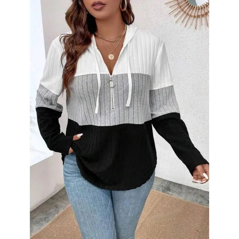 【Plus Size】 Colorblock Drawstring Half Zip Up Hoodie, Casual Long Sleeve Hooded Sweatshirt for Spring & Fall, Women's Clothing for Daily Wear
