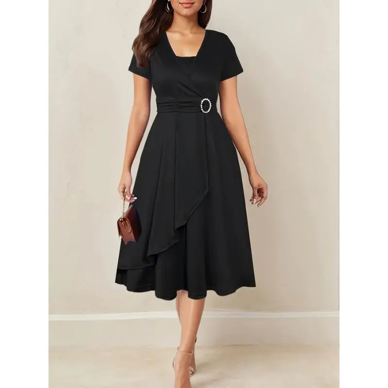Composition:95% Polyester,5% Spandex/Material:Polyester/Length:Midi/Sleeve Length:Short Sleeve/Sleeve Type:Regular Sleeve/Hem Shaped:Asymmetrical/Details:Asymmetrical/Pattern:Solid color/Applicable People:Adult/Sheer:No/Dresses Length:Midi/Type:A Pendulum/Season:Spring/Summer/Fall/Operation Instruction:Machine wash, do not dry clean/Style:Elegant/Fit Type:Skinny/Fabric Elasticity:Mid Elasticity/Printing Type:No Printing/Weaving Method:Knit Fabric/Collar Style:V-neck/Item ID:NG298092/Origin:Guangdong,China