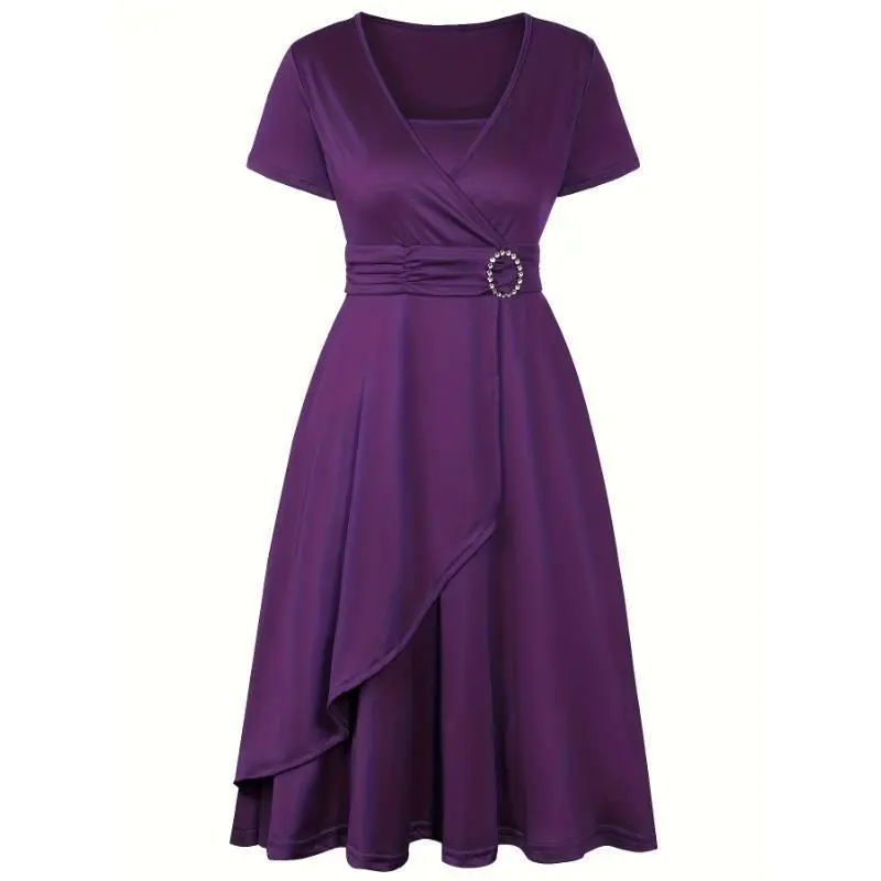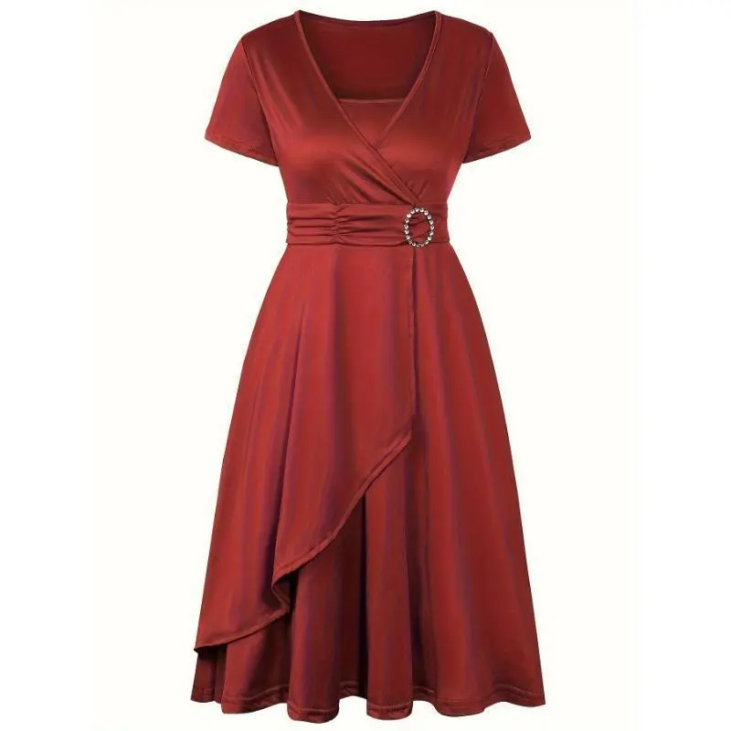 Elegant Maroon Midi Dress with Rhinestone Detail - Short Sleeve, V-Neck, Asymmetrical Hem, Solid Color, Polyester Blend, Machine Washable, Chic Crossed Waist Midi DressHigh comfort Fashion Suitable Popular Elegant Casual Womenswear