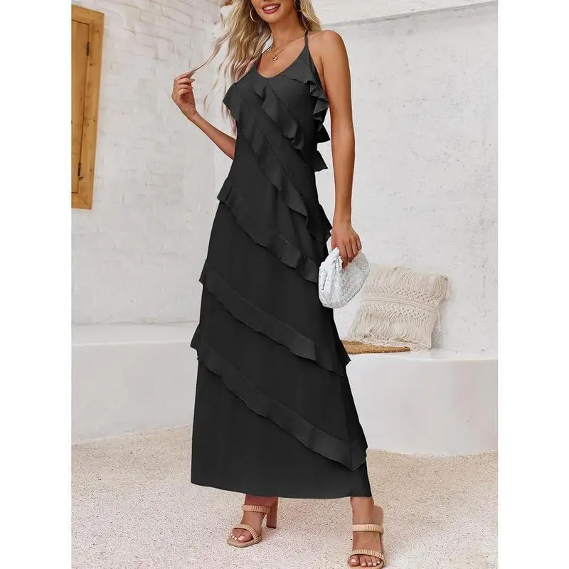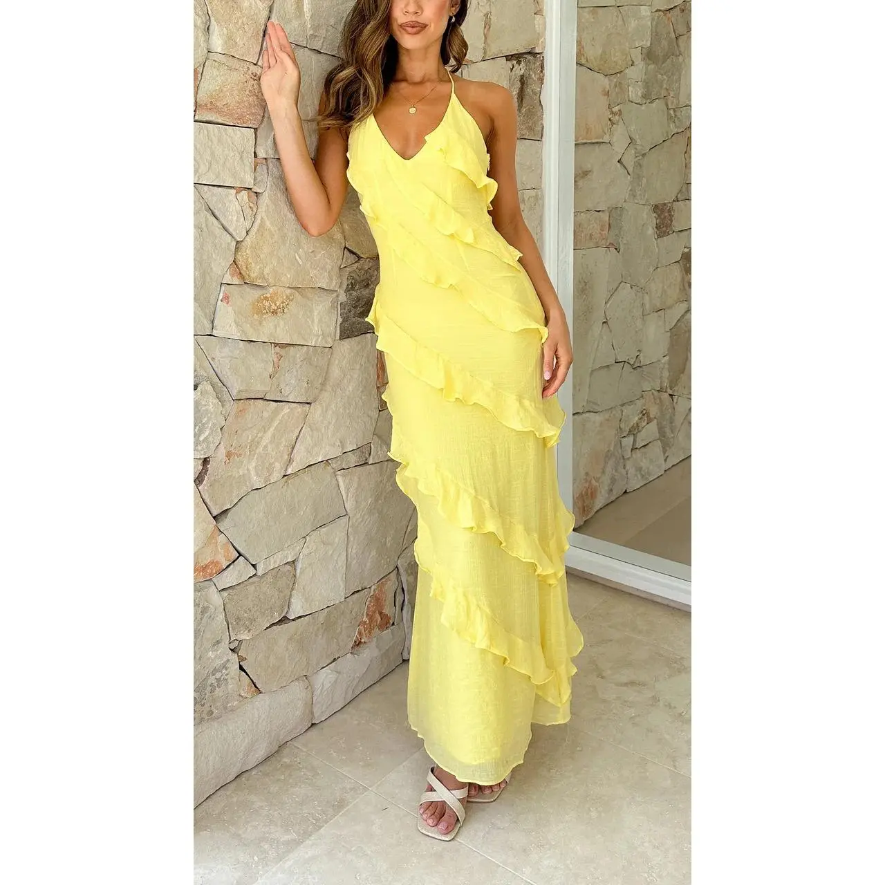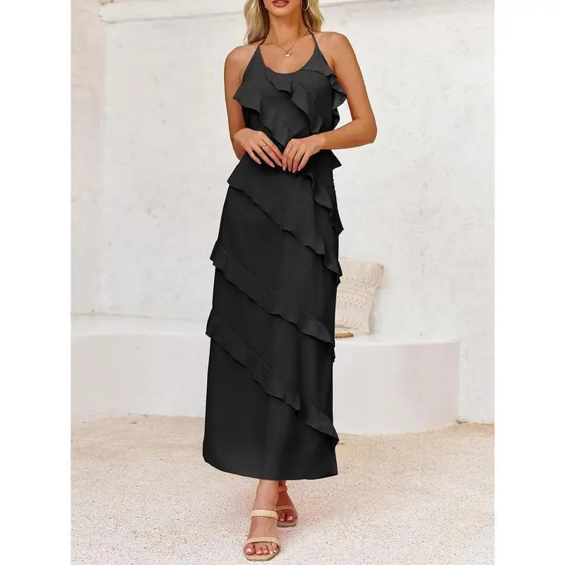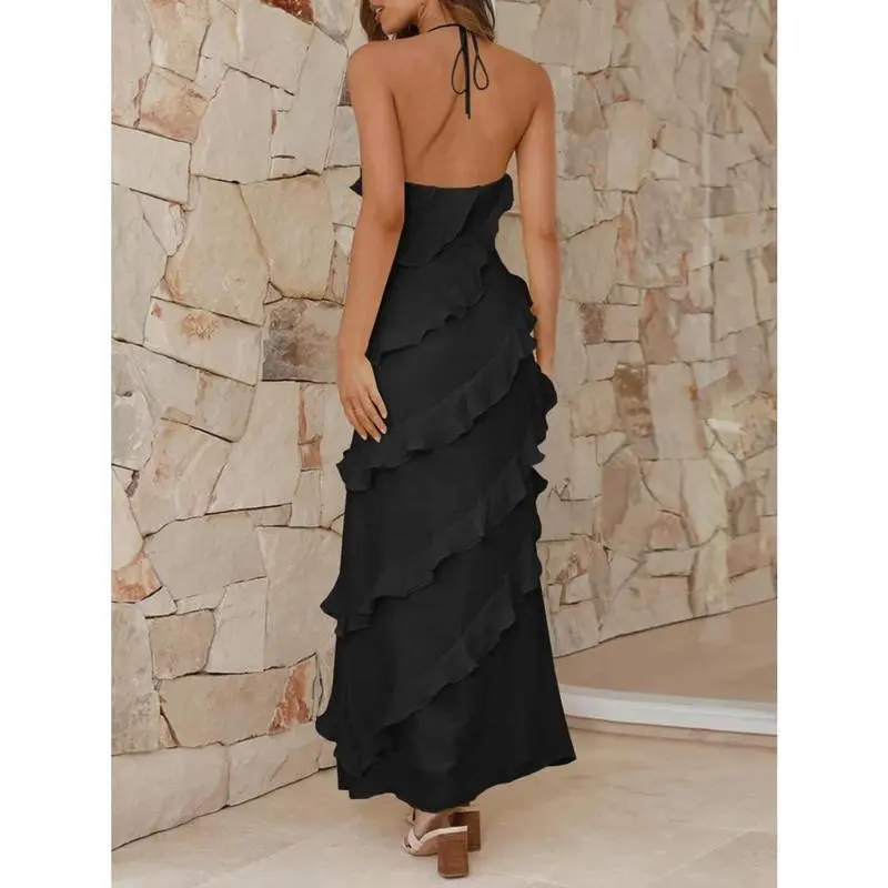 Womens Sexy Chiffon Halter Maxi Dress Sleeveless Backless Ruffle Tassel Party Club Dresses Elegant Formal Clothes Lightweight