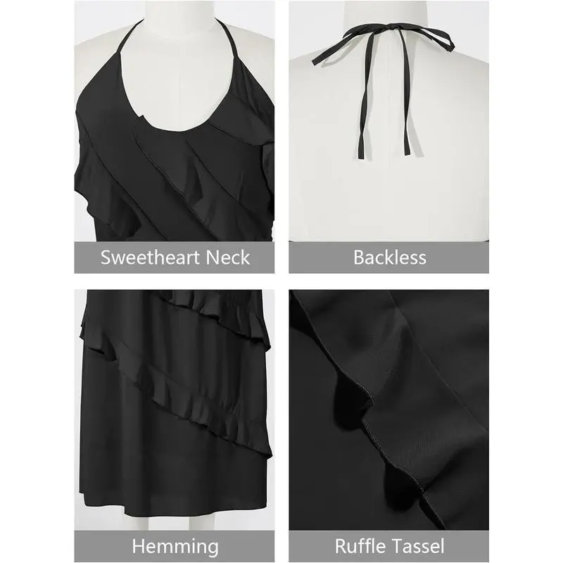 From the brand/Crafted from lightweight chiffon, this dress features a sexy halter neckline, sleeveless design and a captivating backless detail with elegant ruffle and tassel accents./Versatile Color Choices/Available in a variety of colors to suit your personal style and preferences/1/2/Attractive Clothing Details/Sleeveless style offers comfort and freedom of movement for all-night wearchiffon material drapes beautifully, enhancing your silhouette/Ruffle and tassel accents add a touch of flair and elevate the dress to a show-stopping piece