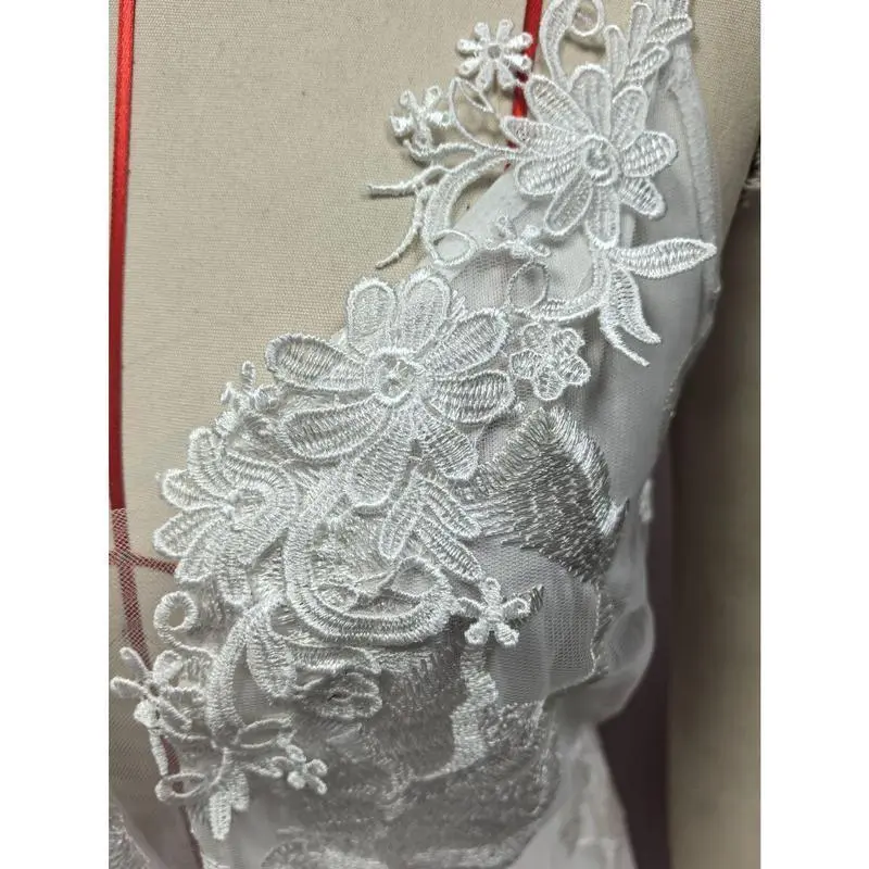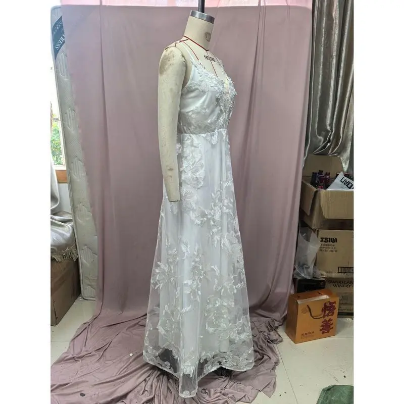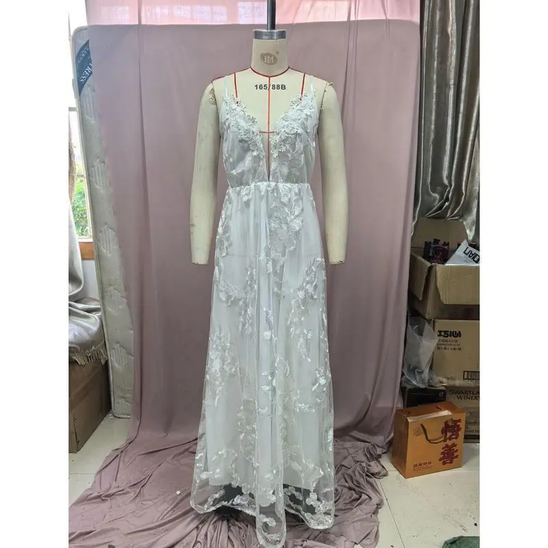 Material: Super soft flowing chiffon with embroidered sequin lace./Elegant design: Sexy V-neck with lace sleeves; flowing chiffon A-line skirt with train.Suitable for casual weddings, outdoor weddings, beach weddings, garden weddings, autumn weddings, winter weddings, formal dinners, religious weddings./Bridal style: Sleeveless gowns are the best choice to create an elegant, gorgeous, sexy, modern, chic, and charming look./Maintenance: Wrinkles are inevitable after long-term packaging. Please steam iron at low temperature. Hand wash only.