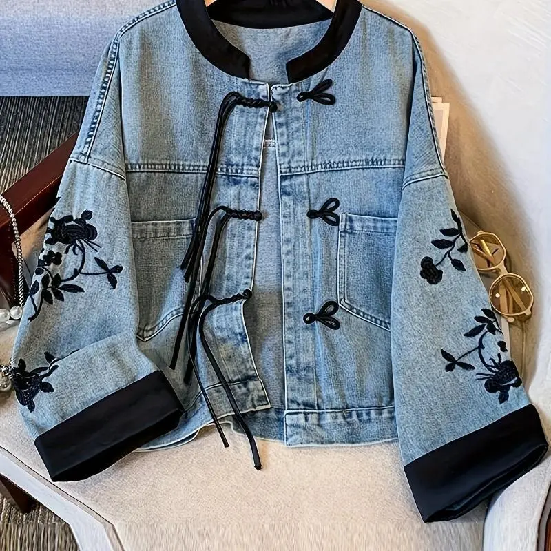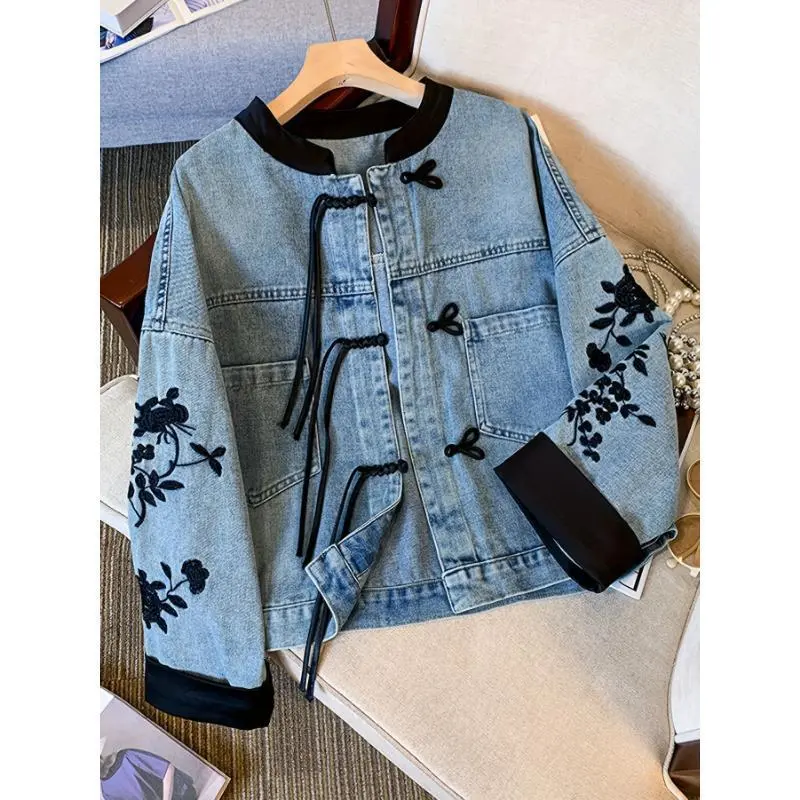 New Spring and Autumn Style Chinese Knot Denim Jacket, Women's Loose Fashion Design Embroidery Retro Popular Top Casual Jacket Fabric Womenswear